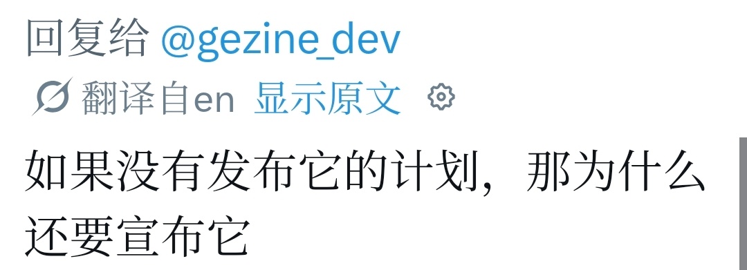 Gezine在帖子里明确写着:没有发布计划。可能是因为上次BD-JB事件让他遭受严重网络暴力,他已多次表示“不想再被不感恩的玩家纠缠”。