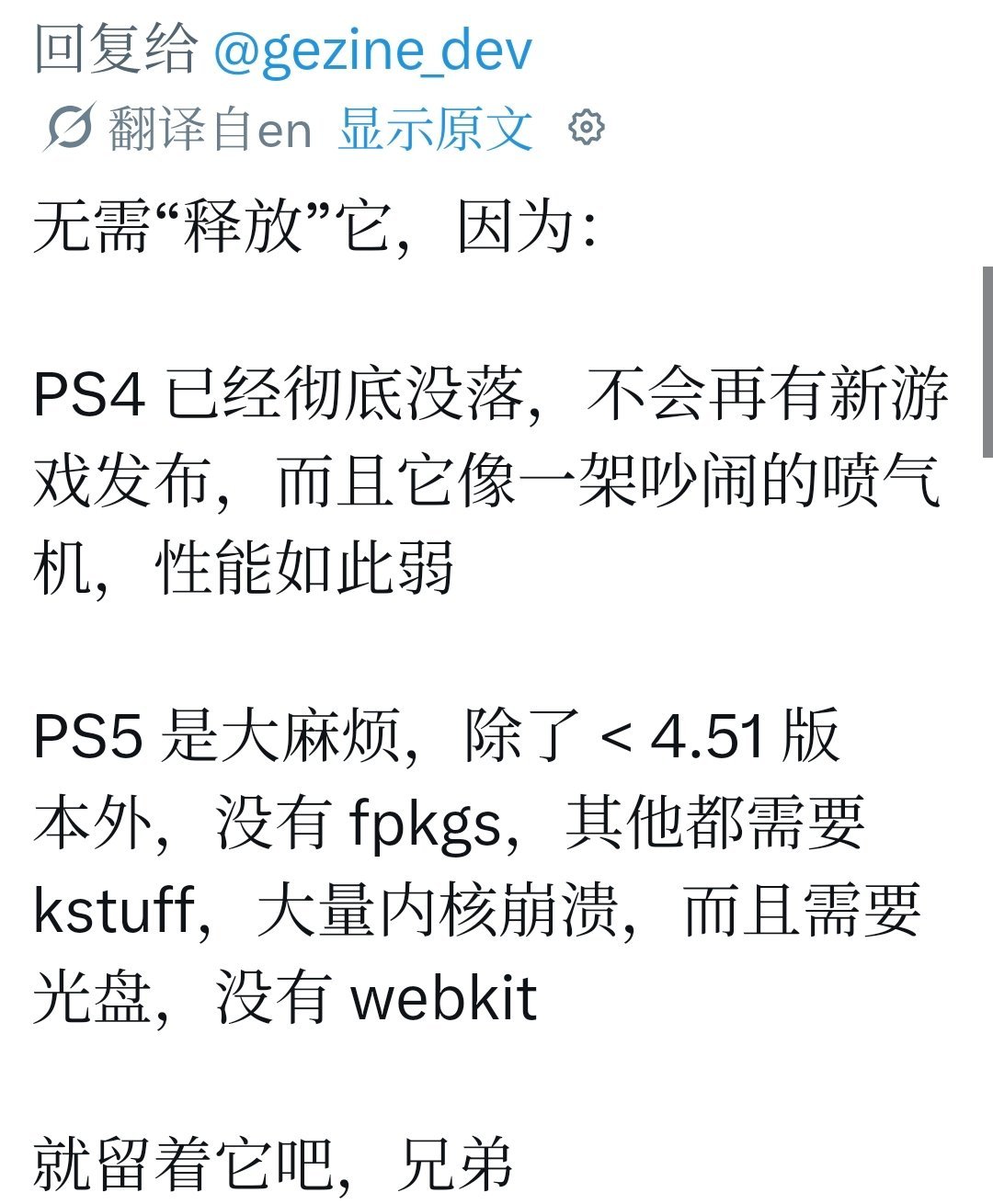 一旦公开,我们就可以做到永久越狱:任意固件版本均可越狱,无需降级或特定硬件。盗版游戏:轻松运行游戏备份、安装自制软件、模拟器、Linux等。在线作弊:修改游戏内存、作弊工具泛滥,破坏PSN公平性。白金奖杯篡改:解锁所有成就、修改存档。Sony面临巨大压力:PS5销量已过亿,安全体系将面临系统性挑战,可能需要紧急推送大规模补丁,甚至影响PS6设计。