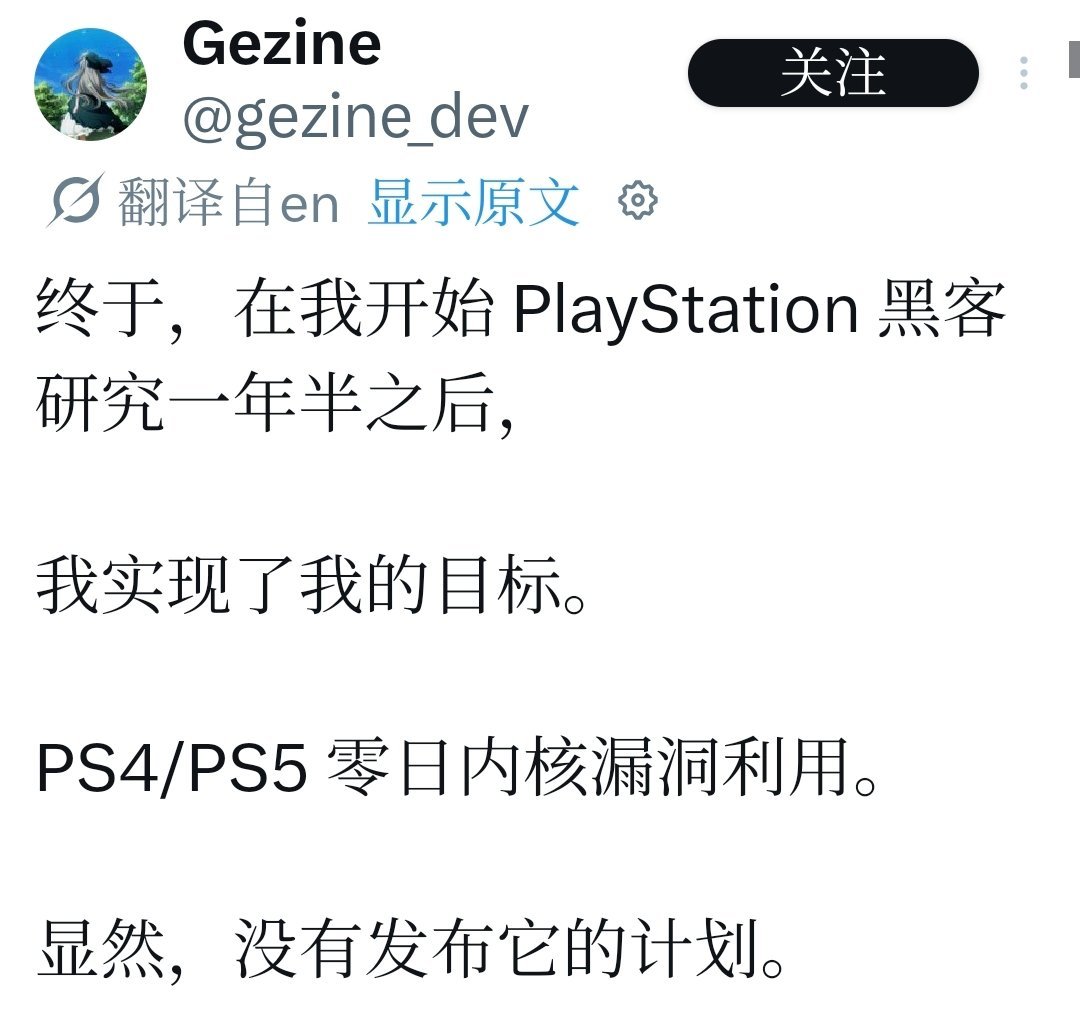 2026年4月15日,韩国PS破解圈知名开发者Gezine当天在网上发帖,正式宣布自己成功实现PS4/PS5零日内核漏洞,并附上了一张系统截图作为证明。