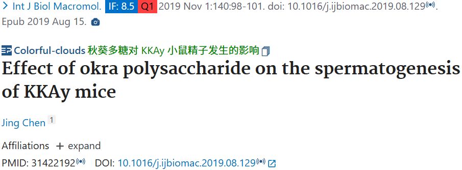 文献1:Chen J. Effect of okra polysaccharide on the spermatogenesis of KKAy mice. Int J Biol Macromol. 2019 Nov 1;140:98-101. doi: 10.1016/j.ijbiomac.2019.08.129 .
