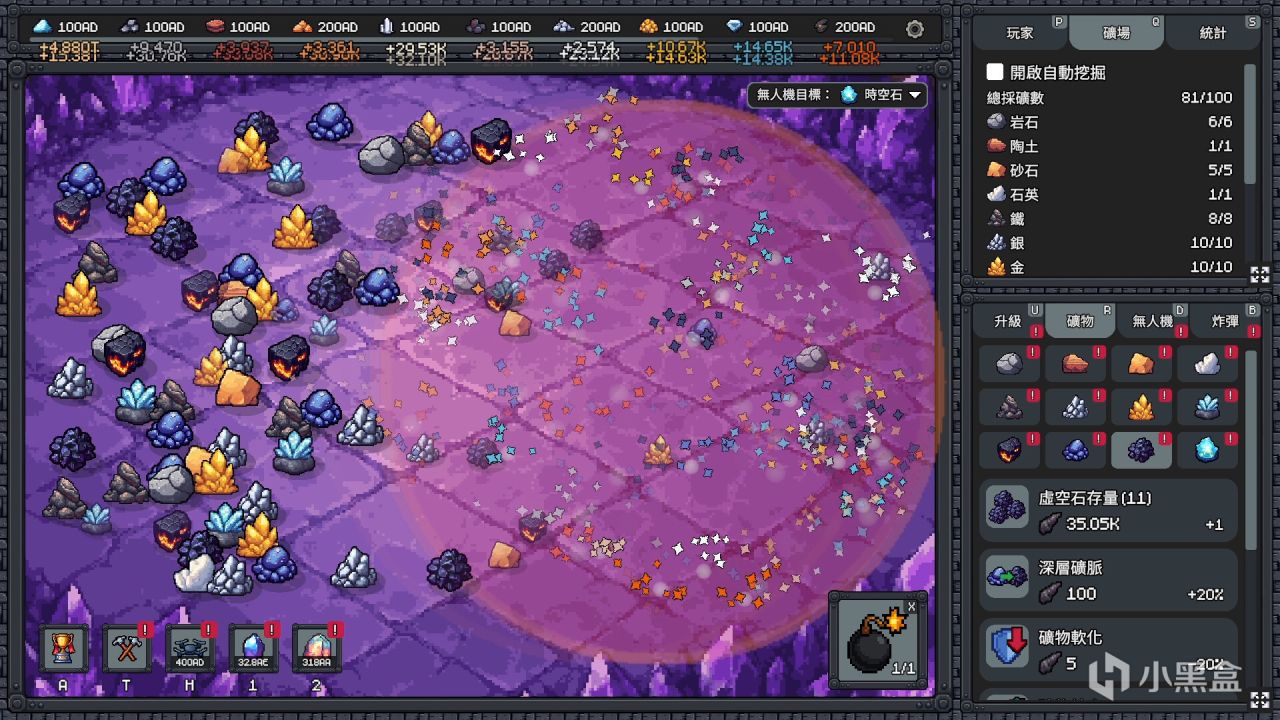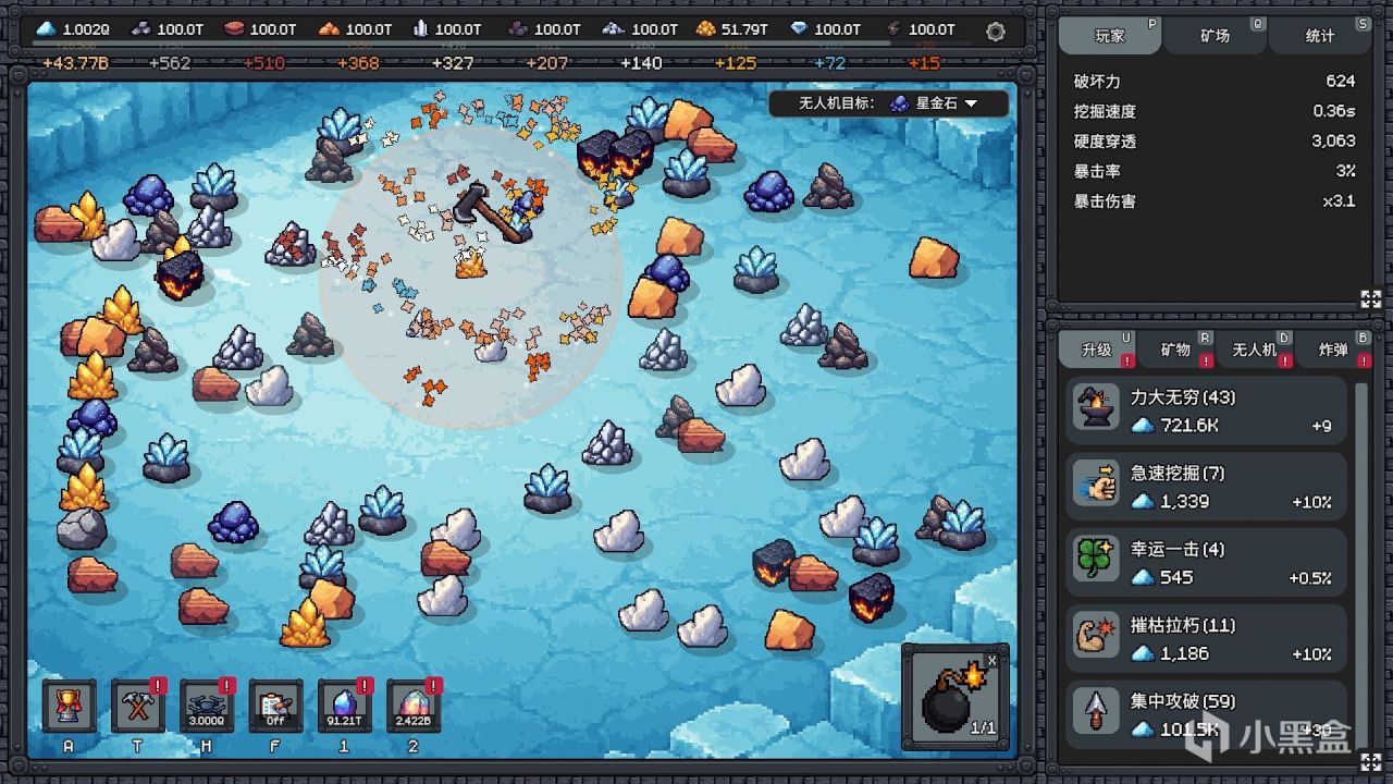 【人力开采】、【无人机】和【炸弹】也有各种的技能树,每一项技能都有几十级甚至无限级,需要的资源也是指数级提升——高级的矿提供的资源同样指数级提升。