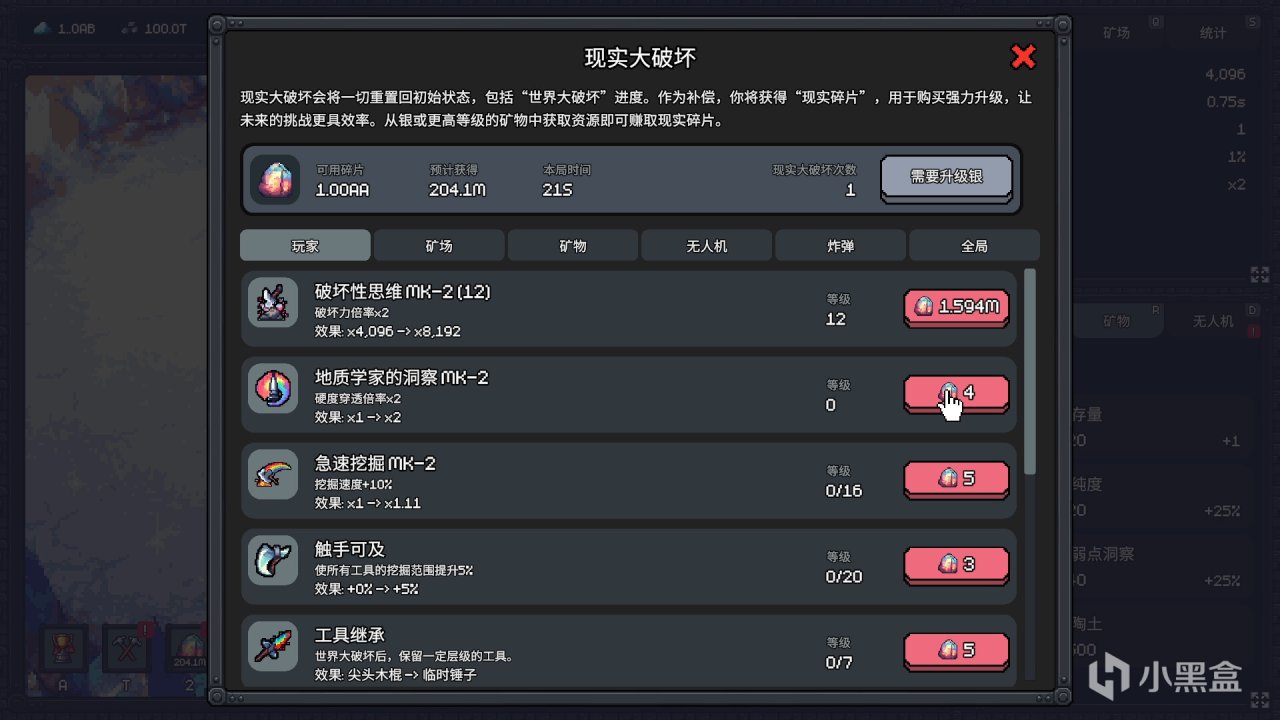 这一步《我家有矿》就通过“大破坏”实现了这一点——每一次你重制世界,都可以获得永久性的、指数级的提升,在长线养成的外围又增加了新的一层。