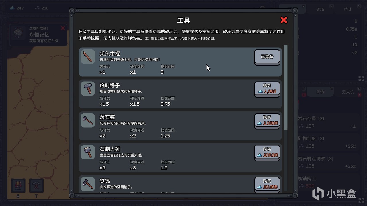 当然“成长”是一个离不开的话题,你可以购买高级的工具,有更强的伤害倍率、更高的穿甲(越是高级矿护甲越高)、更大的挖掘半径;
