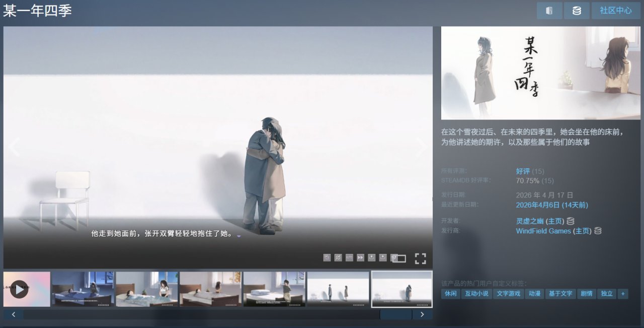 《某一年四季》现已免费上架 Steam,游戏没有互动分支,流程在50分钟左右,感兴趣的话可以前往商店页面免费下载。