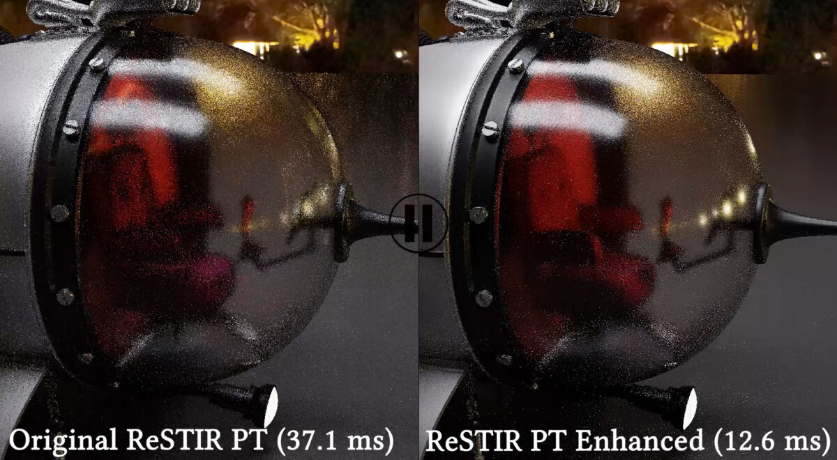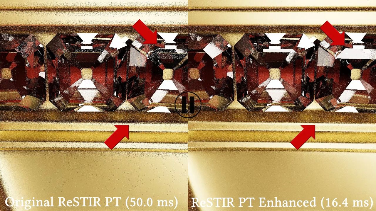 (对比图注:左 原版ReSTIR PT(47.1毫秒)| 右 ReSTIR PT增强版(21.4毫秒))