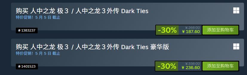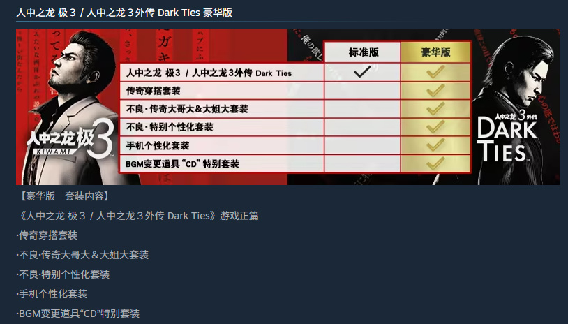《如龙 极 3 / 如龙 3 外传 Dark Ties》现已迎来 7 折新史低价!标准版售价¥187.6