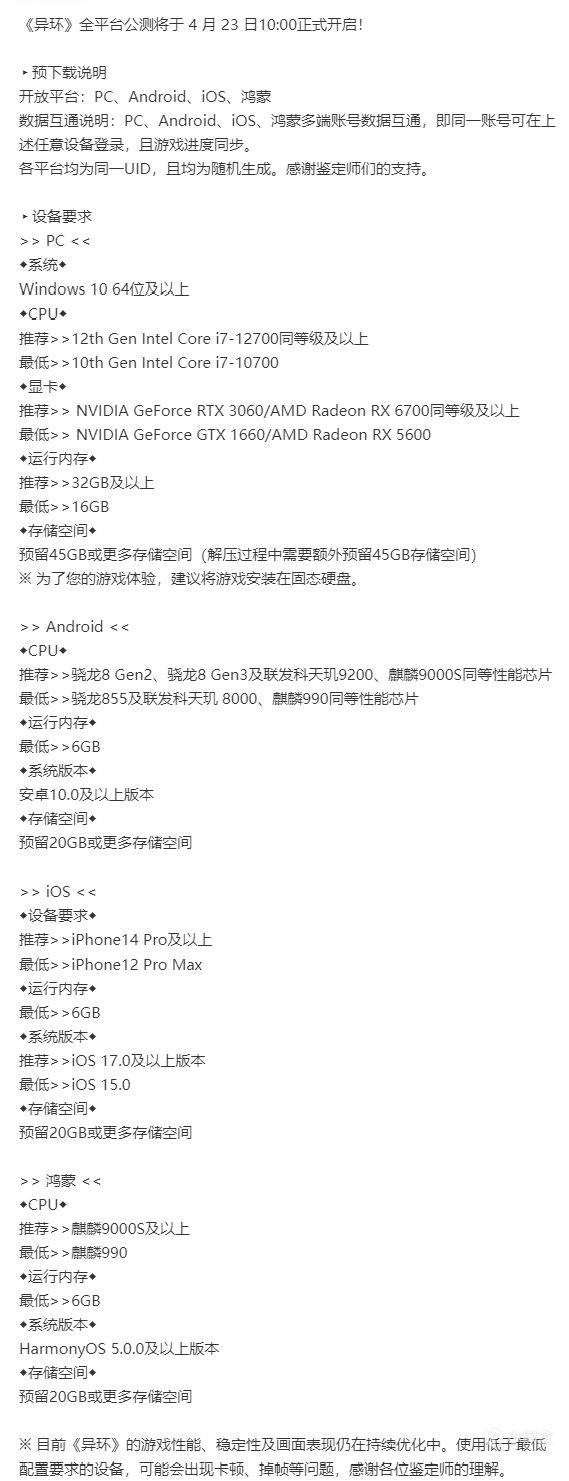 目前遊戲性能、穩定性及畫面表現仍在持續優化中。使用低於最低配置要求的設備,可能會出現卡頓、掉幀等問題