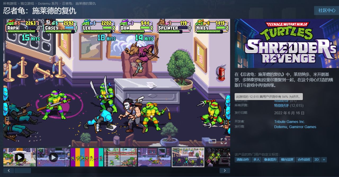 横版格斗,像素画风,梦回80年代动画片。每个龟手感都不一样,连招华丽、场面混乱得像披萨派对