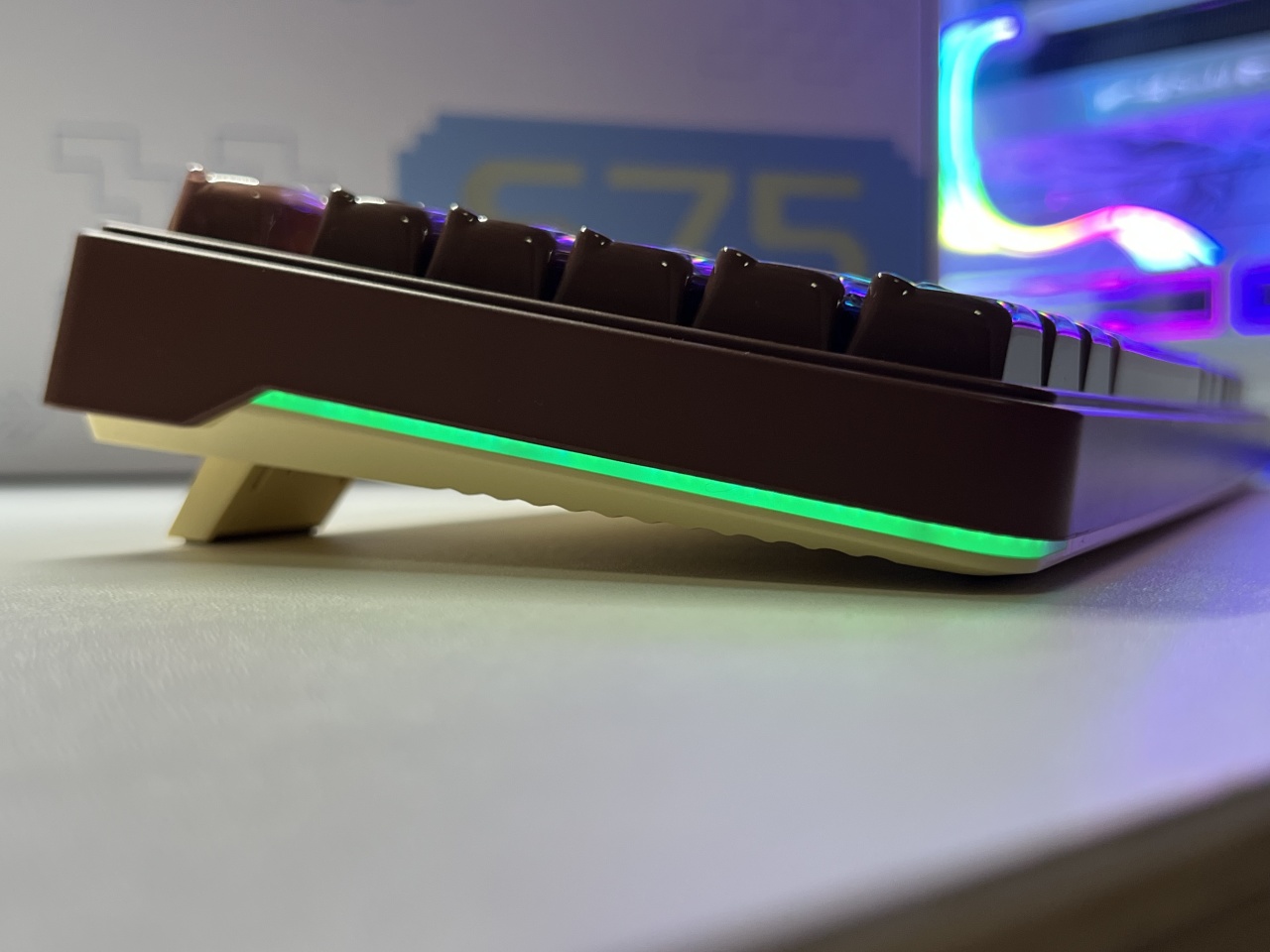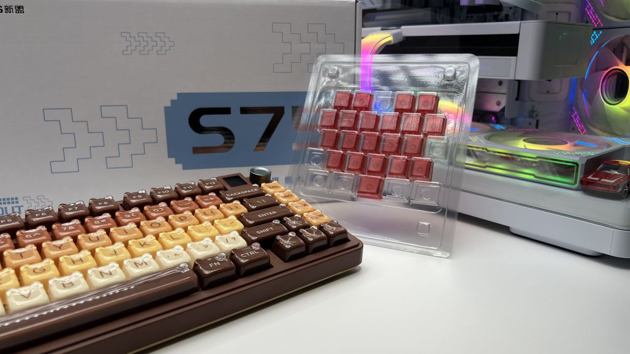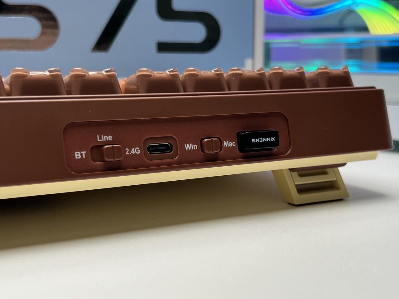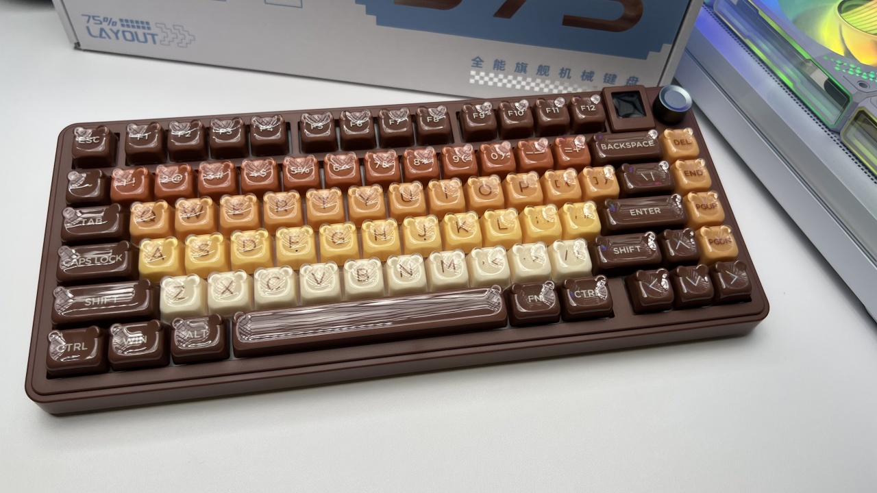 两款配色粉色是音律多巴胺,咖色是焦糖布朗尼小熊,我手上的是S75Pro焦糖布朗尼小熊,音律多巴胺没拿到实物就没办法给大家详细介绍了,不过它整体粉色基调+个性化元素拉满的粉色键帽,还是很适合女性玩家的。