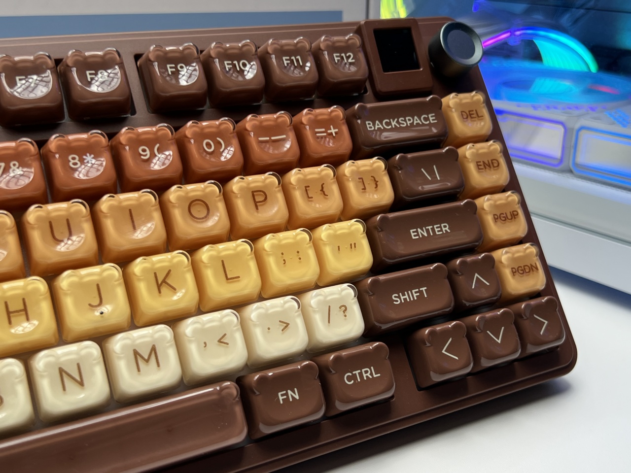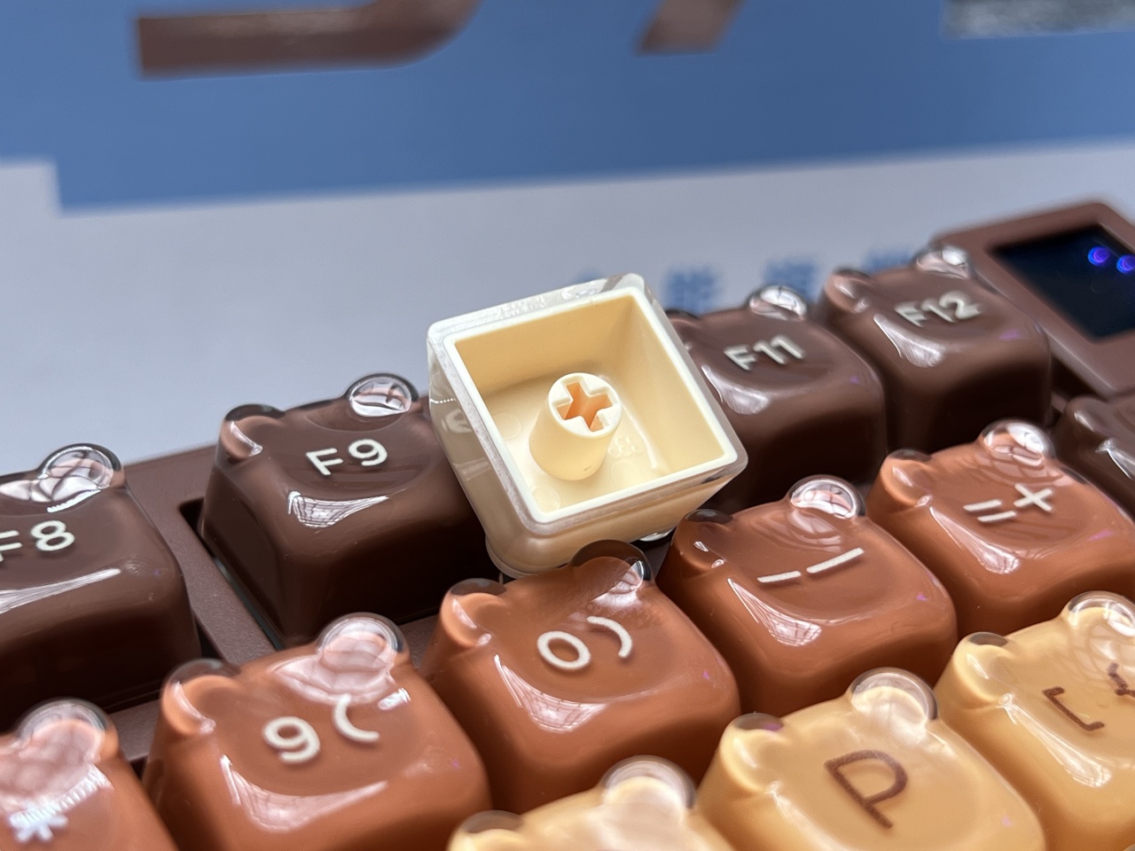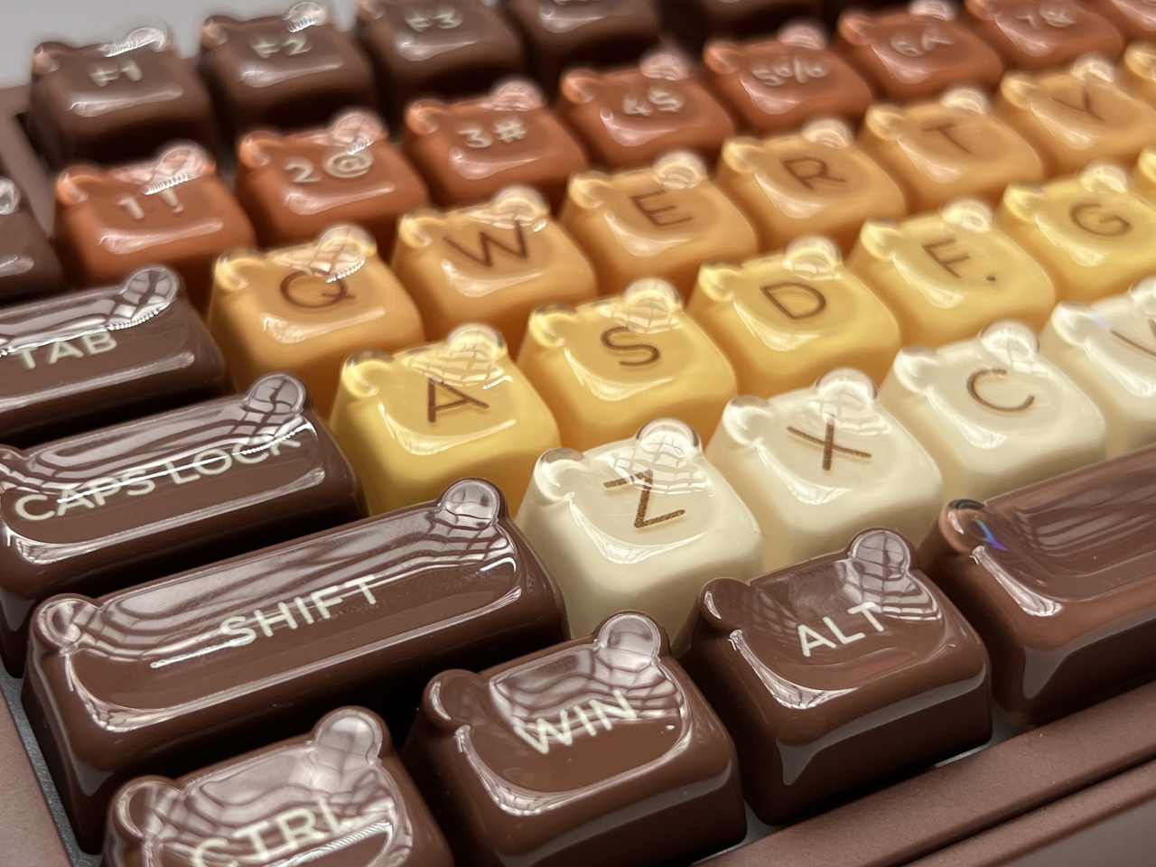 焦糖布朗尼小熊最有特点的是它的键帽,高度是类MOA高度,键帽正面是很可爱的小熊脸,和配色名呼应上了;小熊键帽正面接触指腹的位置还做了凹面,在敲击键帽时能更贴合指腹。