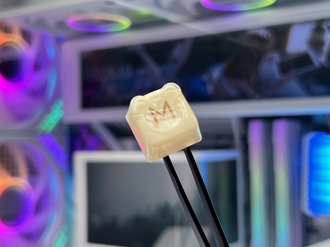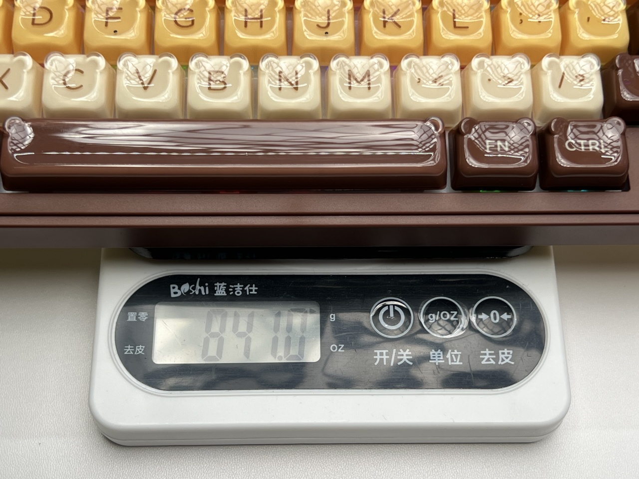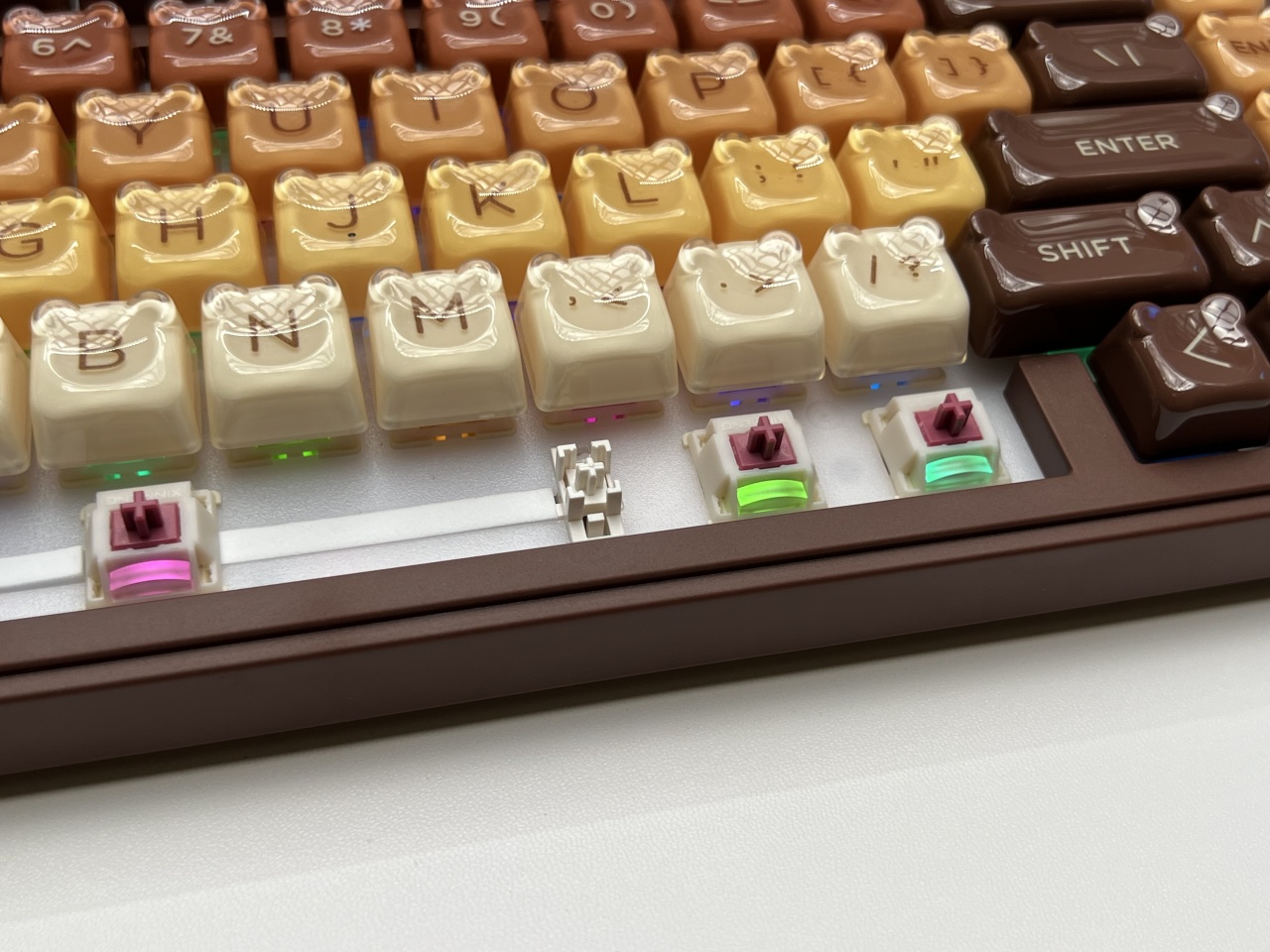 焦糖布朗尼小熊最有特点的是它的键帽,高度是类MOA高度,键帽正面是很可爱的小熊脸,和配色名呼应上了;小熊键帽正面接触指腹的位置还做了凹面,在敲击键帽时能更贴合指腹。