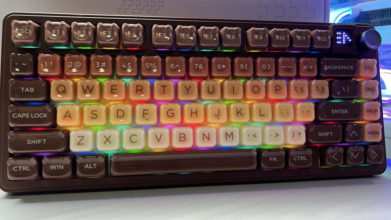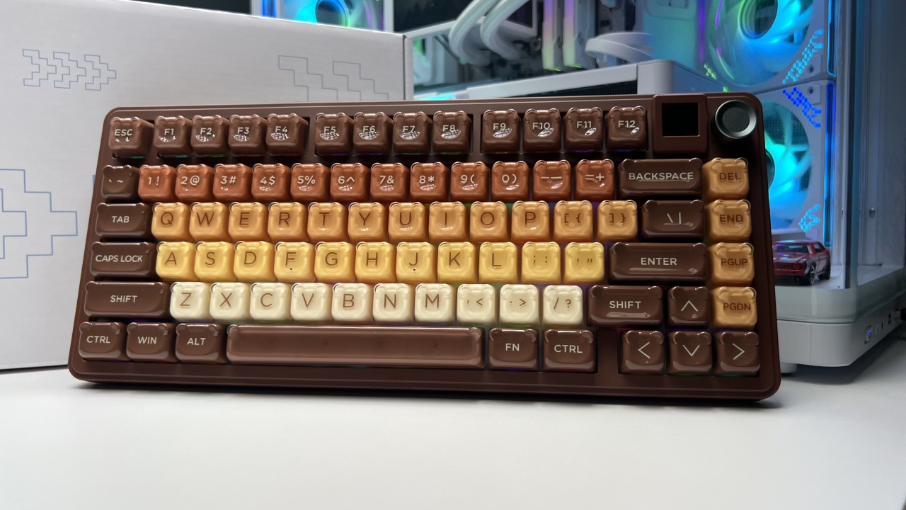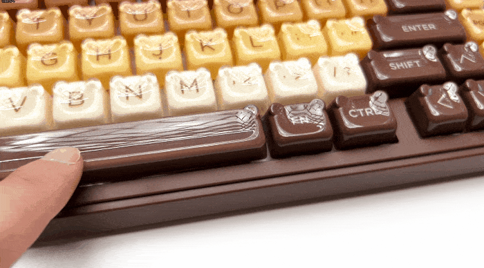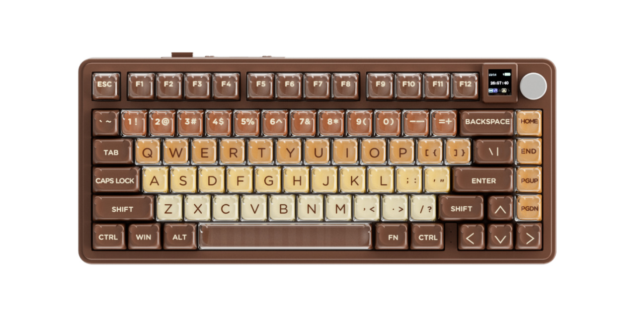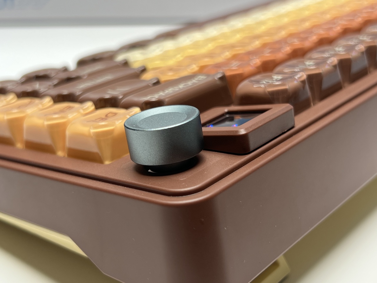 焦糖布朗尼小熊整体以咖色为主,正面键帽部分是五种“甜品色”的撞色,加上如同奶油般奶黄色的底壳,真的很有焦糖布朗尼的味道。