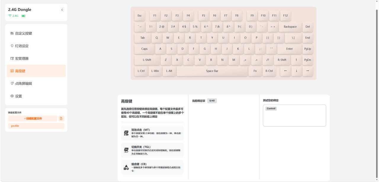 驱动是新盟自研的网页驱动,换设备只要点开网页就能随时随地进行键盘功能的调节,常规功能比如宏录制、改键、调节灯效等,还有类磁轴的SOCD、MT等按键功能。