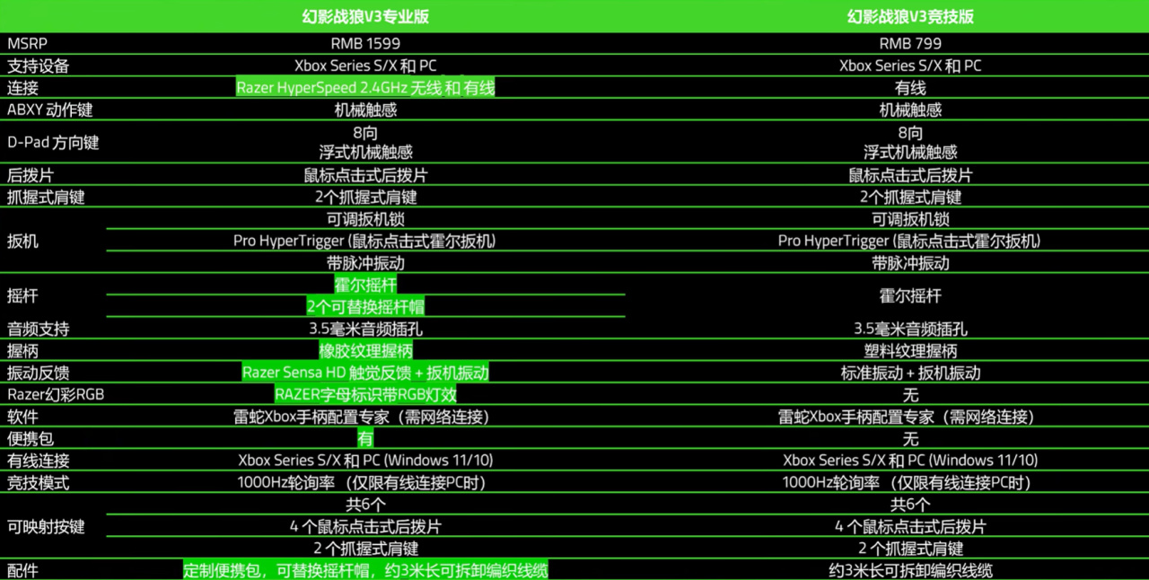 雷蛇幻影战狼V3Pro有竞技版和专业版可选,其中竞技版对比专业版仅支持有线连接,没有橡胶握把和RGB灯效,没有HD震动。当然啦,竞技版的价格是香的,只要专业版一半的价格就能拥有它,所以如果你预算有限、想整雷蛇外设全家桶、能接受有线连接,那么竞技版也不失为一个好选择。