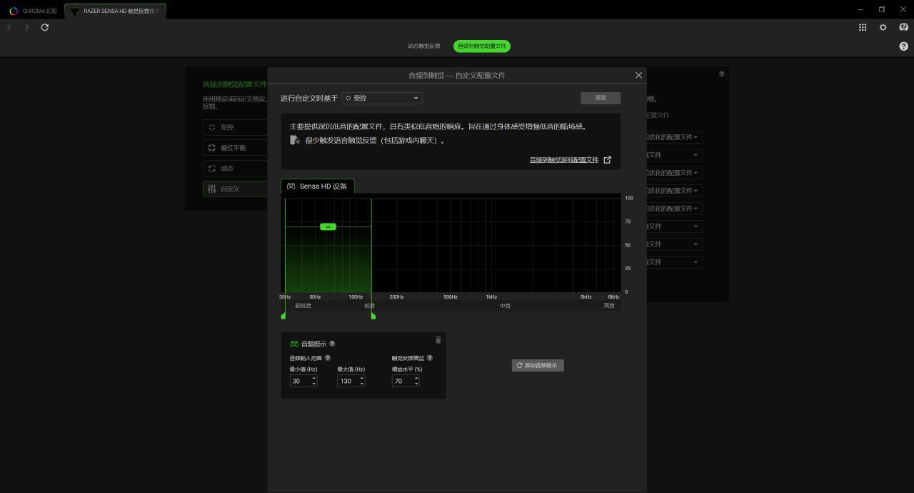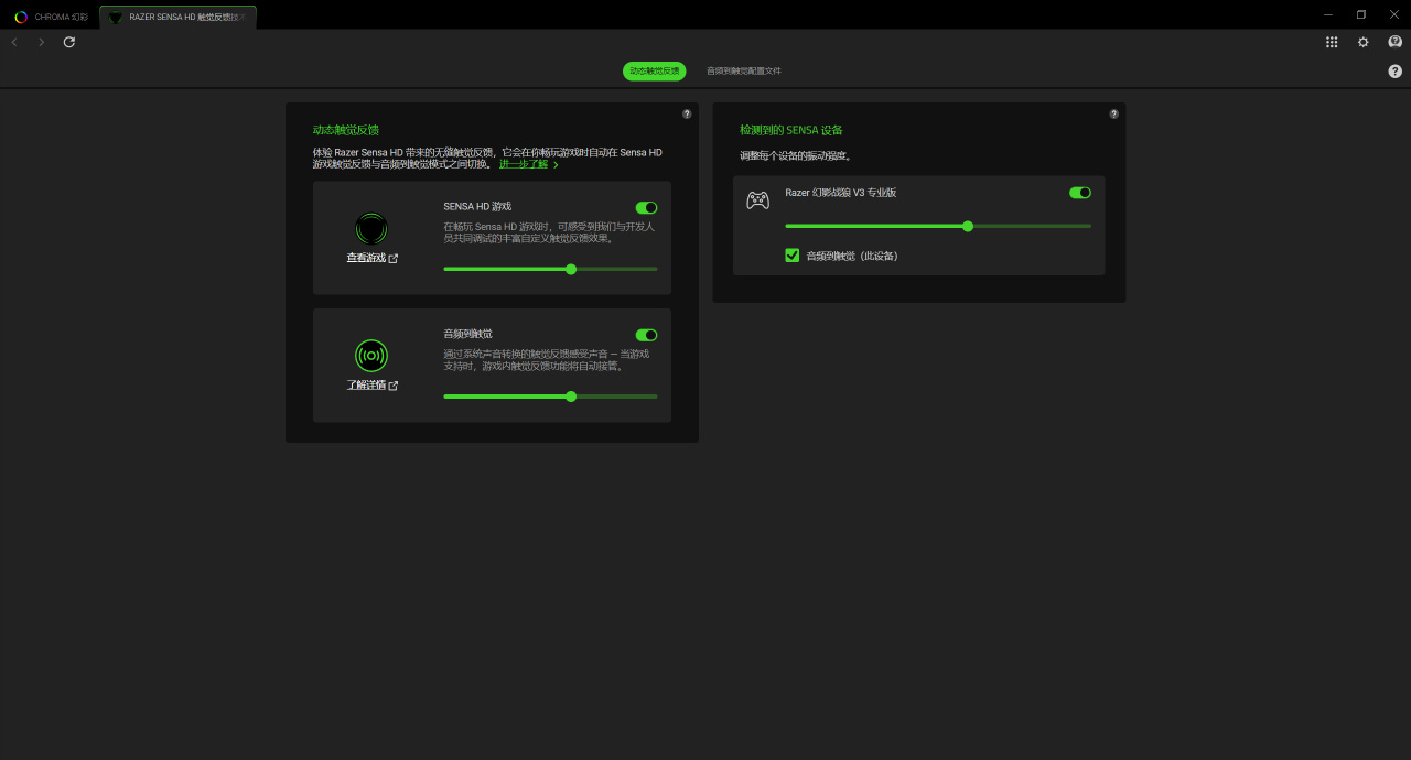 二是音频触觉震动,个人觉得这个功能要更牛逼,它能捕获电脑的声音,通过声音频率来模拟实现不同的振动强度。只要是电脑里发出的一切声音它都能捕获,然后根据频率给到玩家一个模拟震动效果。