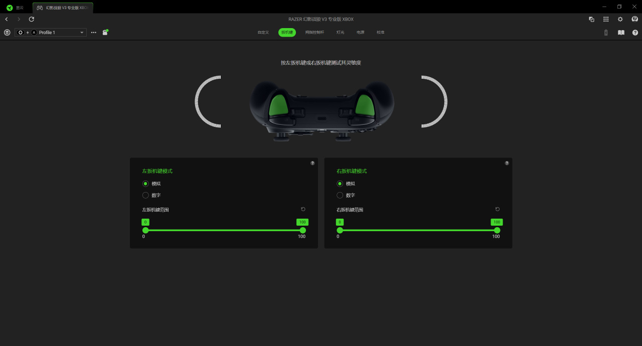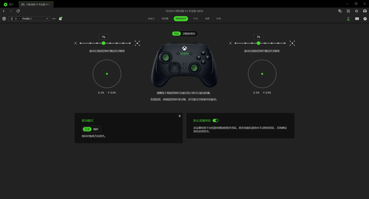 软件方面依旧是大家熟悉的雷云4,在雷云驱动里能直接对手柄进行设置,包括快速预设手柄拓展按键的功能,查看手柄电量、一键设置灯光效果,还有对摇杆进行死区设置和校准。