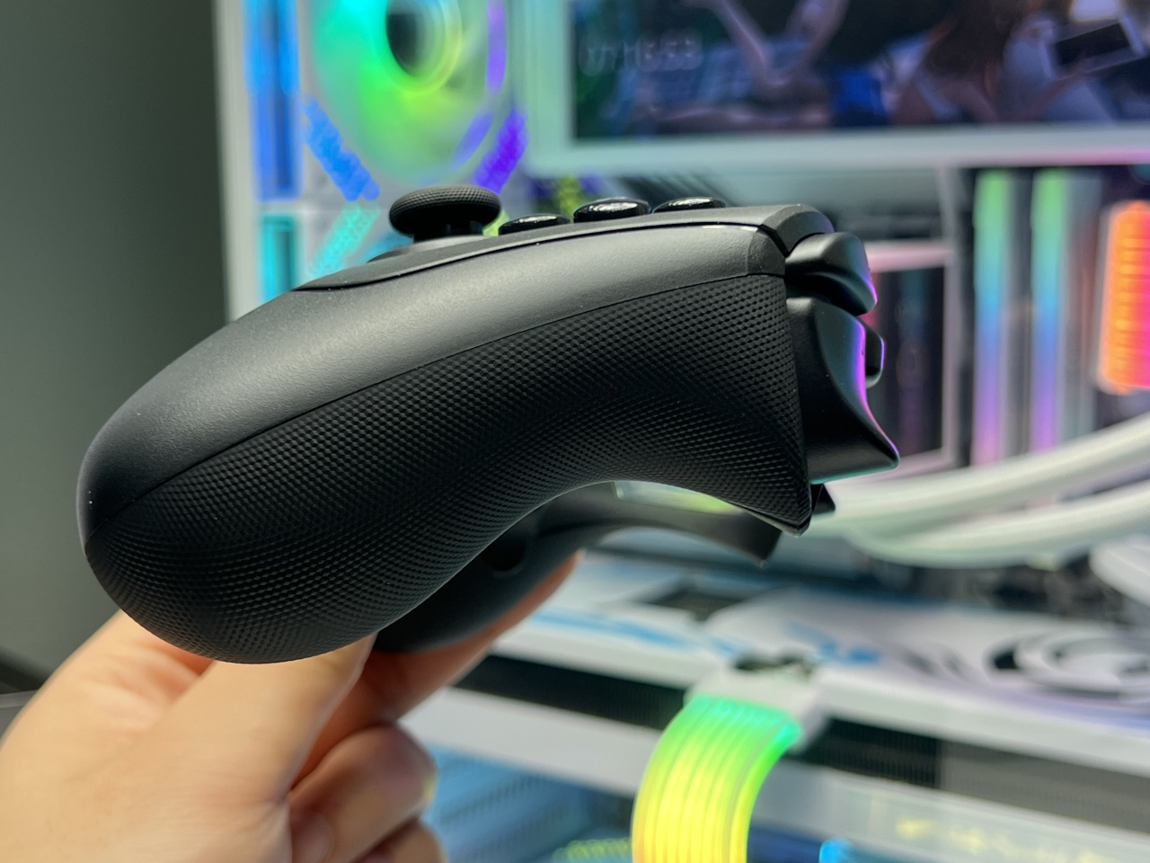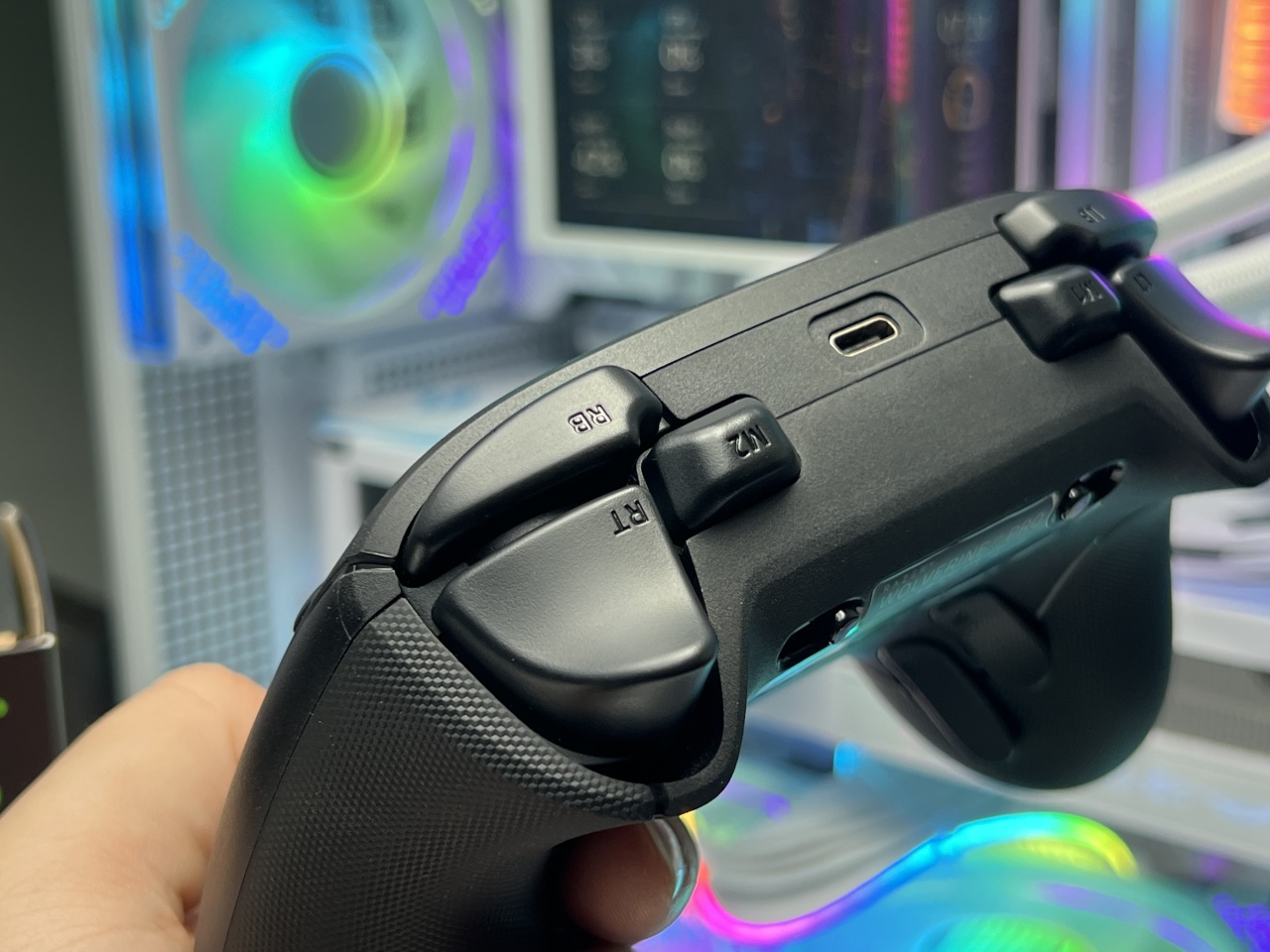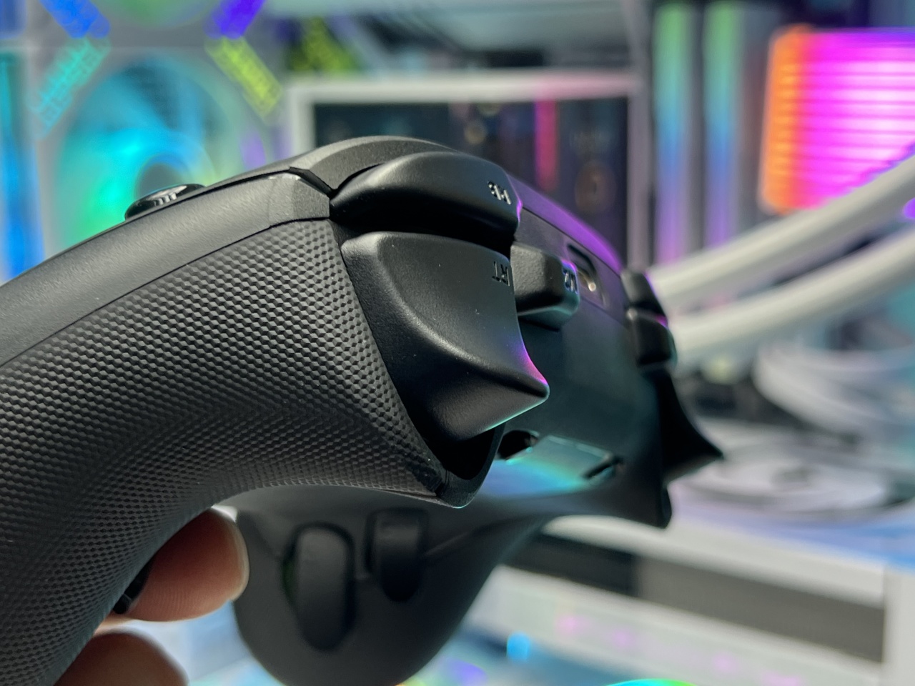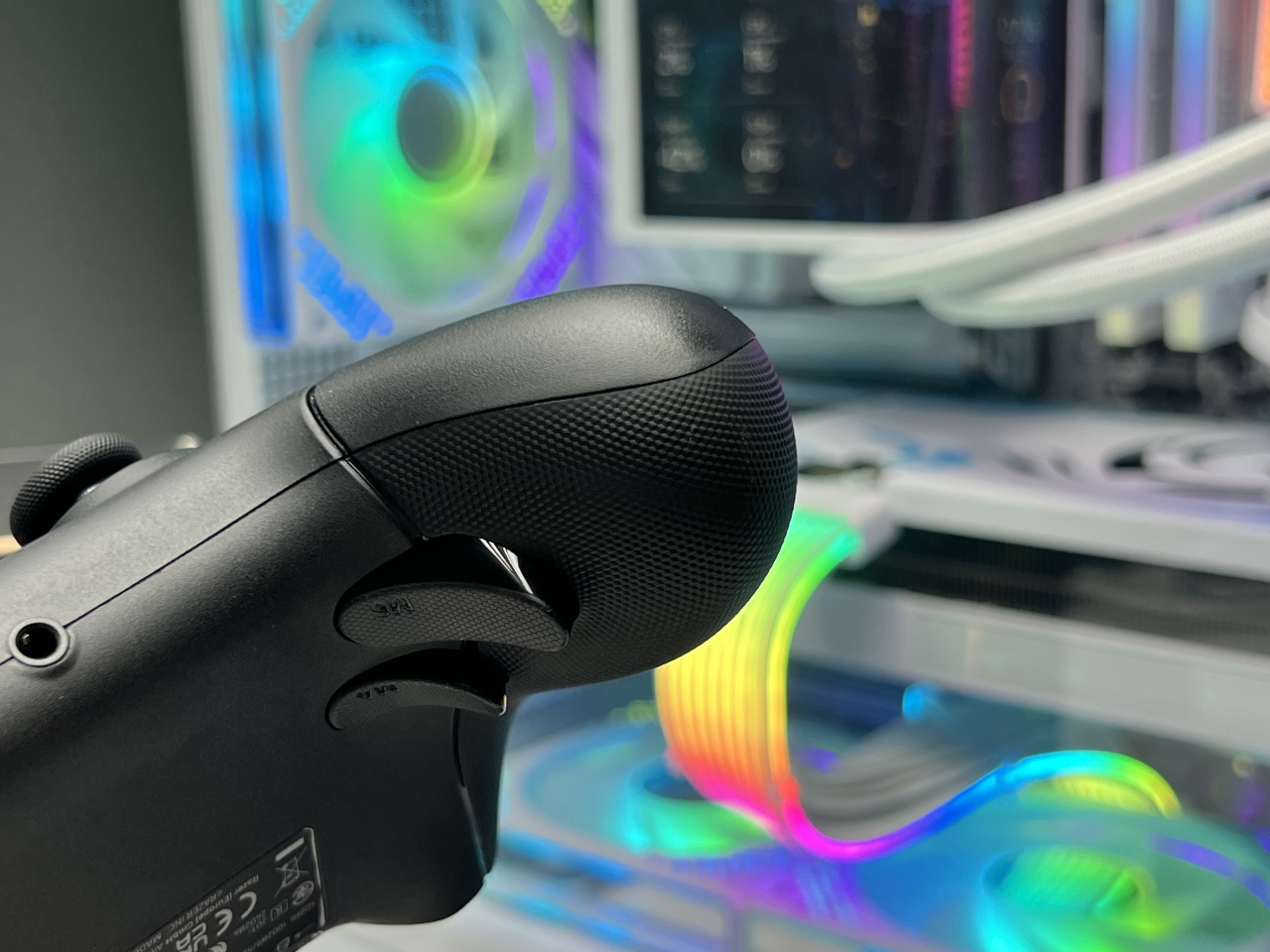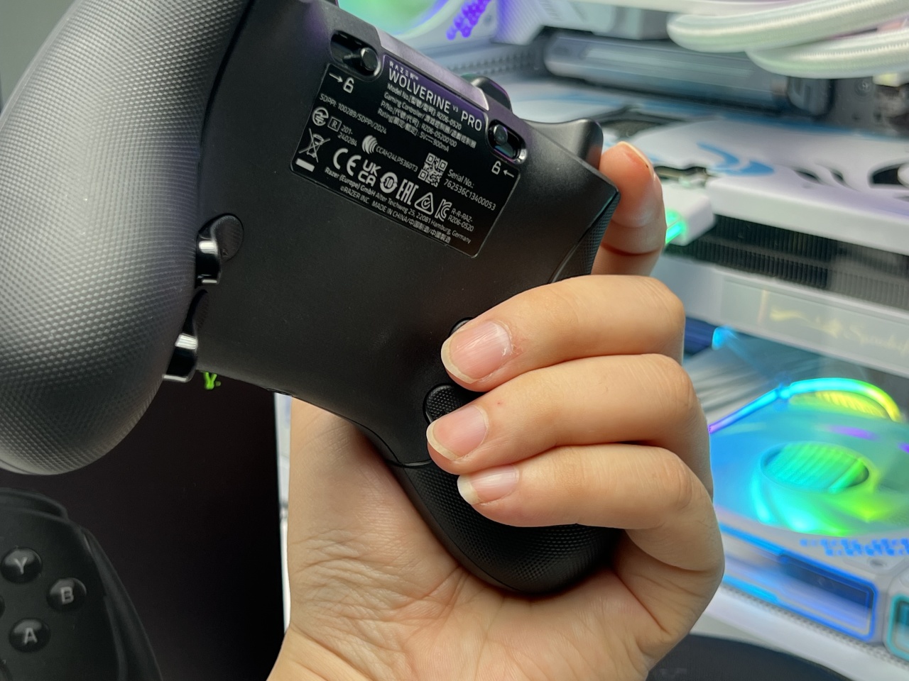 最后就是手柄橡胶握把处的凹陷曲线幅度要更大,给到中指的贴合度要更好,包括无名指和小指也有不错的贴合度,正常握持中指和无名指自然而然就放到底部的四颗背键上了。