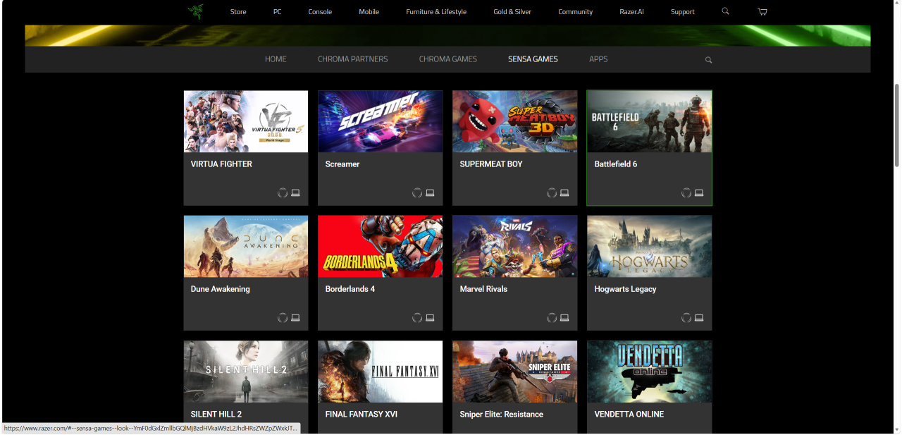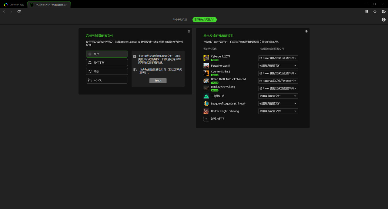 一是雷蛇团队对不同的游戏进行了适配,在马达原有的震动效果上进行了优化,实现更加细腻的震动手感,目前支持的游戏挺多的,和很多游戏厂商都做了适配,简单翻了下Sense Games有数百款游戏,之前在骑仕V3Pro上也夸过它的触觉反馈系统的震动表现。
