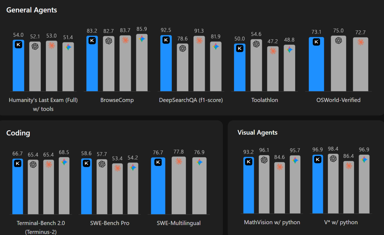 该模型在开源编码领域实现重大突破,多项基准测试达到SOTA水平,包括SWE-Bench Pro 58.6%、HLE with tools 54.0%、SWE-bench Multilingual 76.7%、BrowseComp 83.2%以及Toolathlon 50.0%,在Charxiv(Python)和Math Vision(Python)等视觉+代码任务中同样表现出色,全面超越前代并与GPT-5.4、Claude Opus 4.6等闭源顶级模型形成有力竞争。
