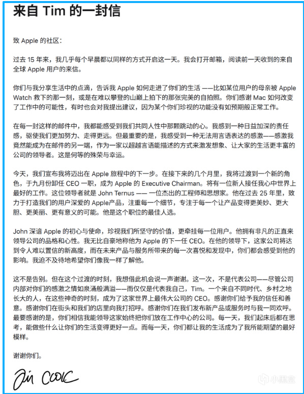库克特意发了封长信跟用户道别。他说自己每天都看用户邮件,有人分享 Apple Watch 救人的经历,有人吐槽功能不好用,这些都成了他工作的动力。