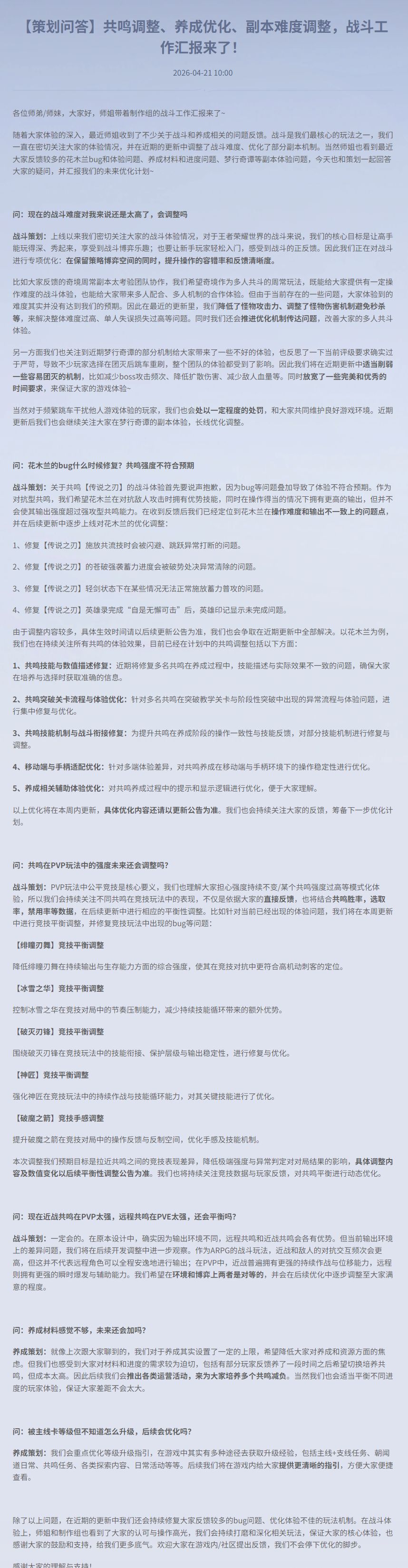 爲提升共鳴在養成階段的操作一致性與技能反饋,對部分技能機制進行修復與調整