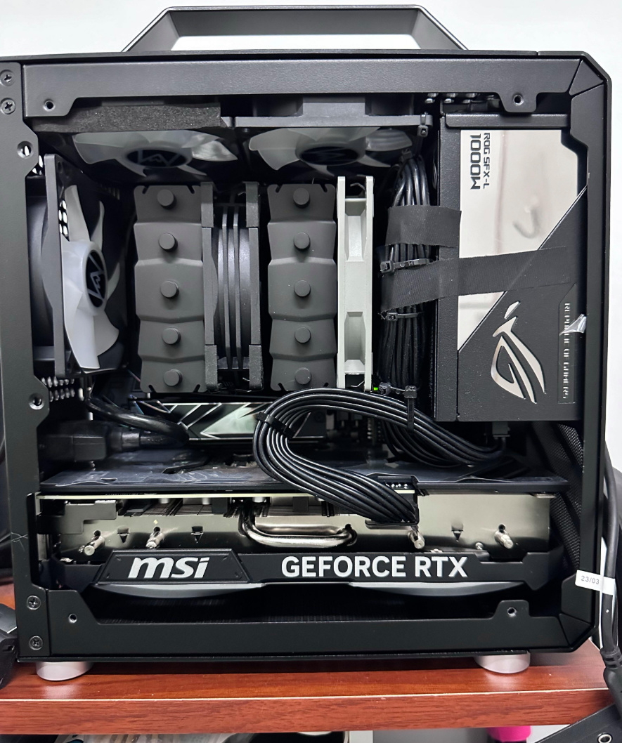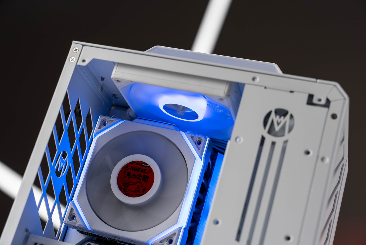 而这是主机内部的样子,空间利用率已经拉满到了最极限的状态,单是内部已经包含了五把风扇;而20cm的猫扇则被固定在机箱外部,与内部的空间不冲突
