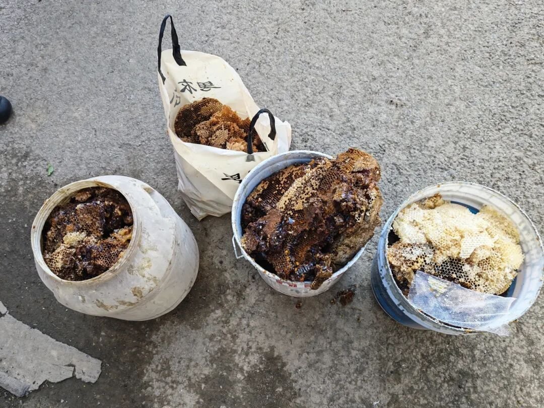 消防員先用藥劑對蜂巢進行消殺,再用工具小心剝離、剷除,整個清理過程耗時較長 。拆下的蜂巢體積龐大,重量驚人,最終用三個大號塑料桶和一個編織袋才全部裝完。
