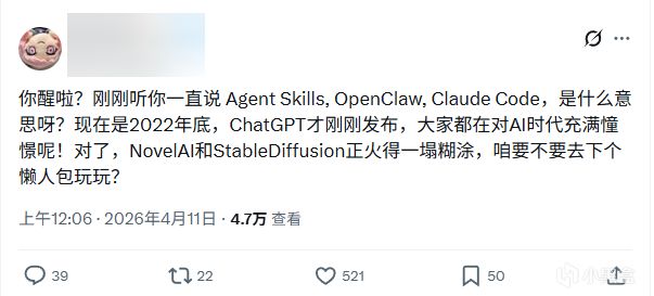 毕竟,这终归还是一个飞速发展的领域——无论应用共识、最佳实践,都仍然在“一天一变”。不止一位朋友曾经告诉茶馆君,投入更多精力在AI上,却没法把这份焦虑抚平太多。OpenClaw刚火爆没多久,社区又开始热议Hermes和Claude Cowork这些“新龙虾”。Harness Engineering、MCP、世界模型这些新词一个又一个出现,当年熬夜学习的ControlNet、生图Prompt咒语,如今回想起来仿佛已经是几世纪前的话题……“这周没学的AI知识,下周就不用学了”是一句经常出现的调侃。