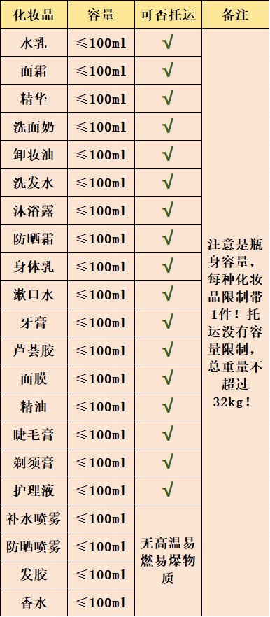 液体单瓶不超过100毫升,注意是瓶身标注的容量,不是你用了多少剩多少!150毫升的瓶子里只剩20毫升也不行,安检只看瓶子大小。