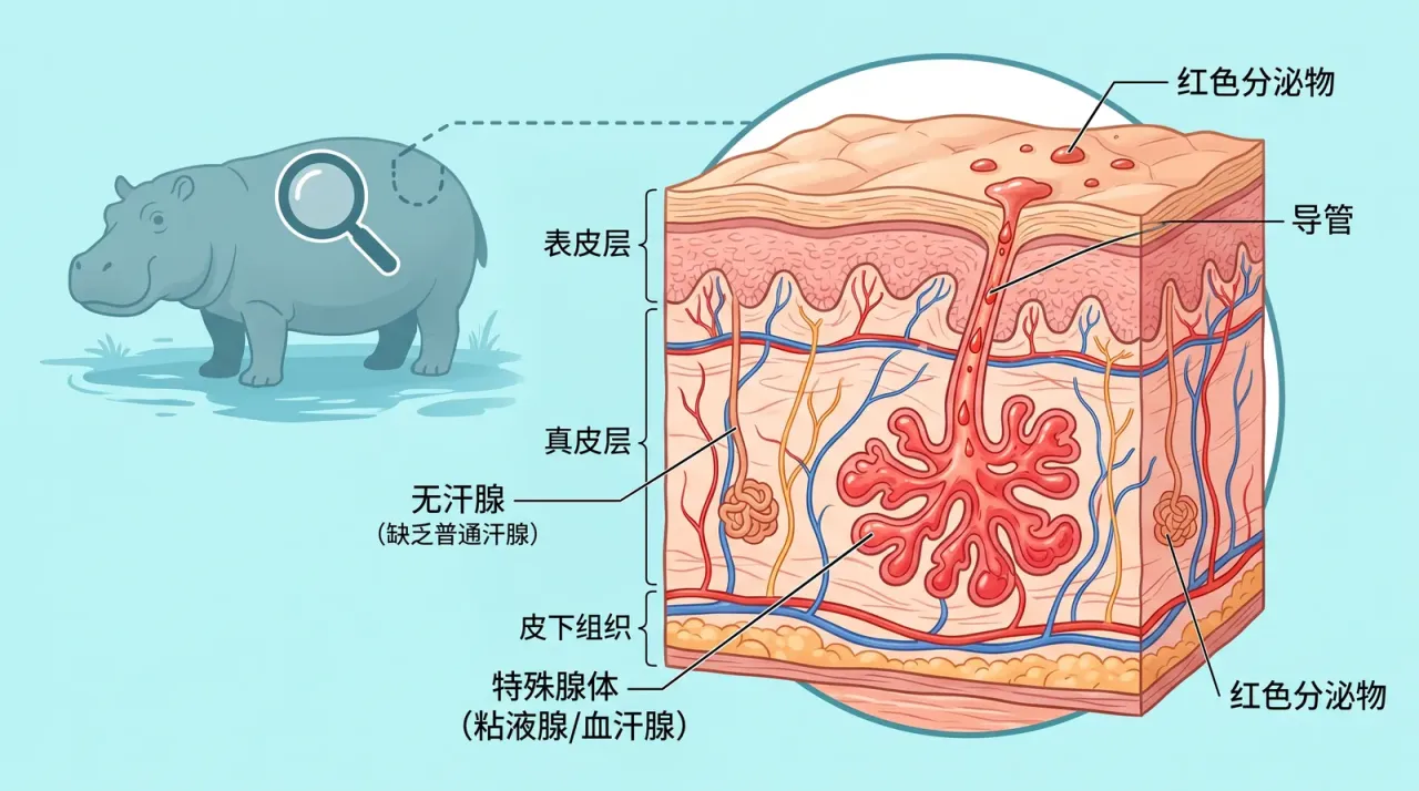 很多人會下意識覺得,那層紅色液體要麼是血,要麼是汗。可河馬其實壓根沒有汗腺,它不會像人一樣靠出汗散熱。