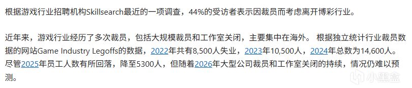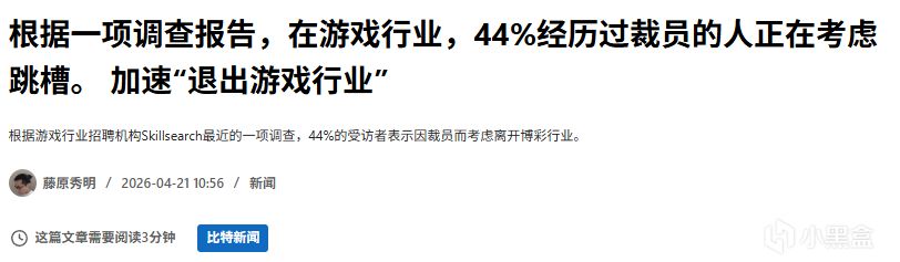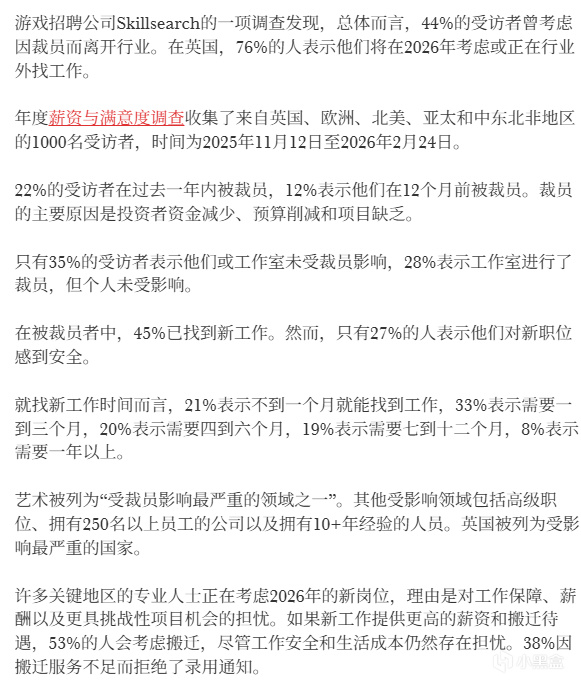遊戲行業人才介紹公司Skillsearch最新發布的《Games and Immersive Salary & Satisfaction 2026 Report》顯示,人員削減後考慮離開遊戲行業的受訪者佔比達44%。