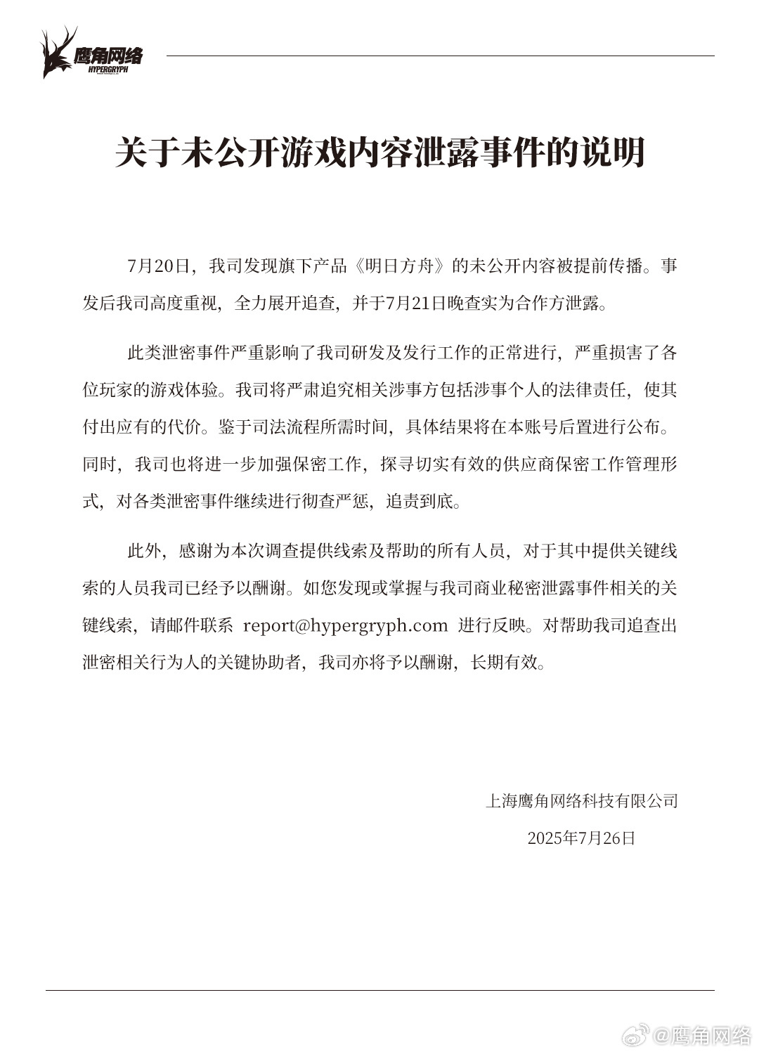 以下是【鹰角网络】官方于2025年07月26日20:30发布的【关于未公开游戏内容泄露事件的说明】。