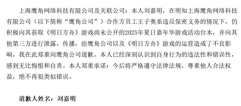 刘某某表示,在明知鹰角网络合作方员工王某某系违反保密义务的情况下,仍积极向其获取《明日方舟》游戏尚未公开的2025年夏日嘉年华游戏活动台本,并向其他第三方进行泄露、传播,给鹰角公司以及《明日方舟》游戏的运营造成了不良影响,因此郑重向鹰角公司道歉。