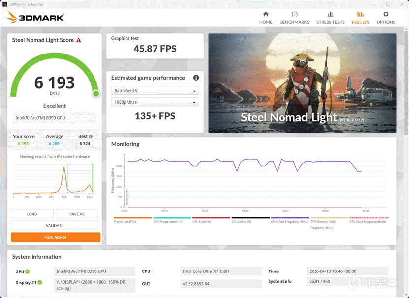 但是GPU就大不一样了,由于9600MT/s的高频内存可以实测提供超过130GB/s的带宽,因此对于Arc B390的性能提升非常明显,比常见的8533频率的B390跑分强了大约5%左右:
