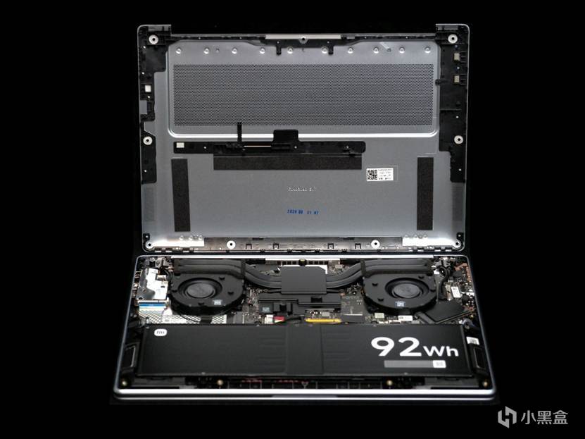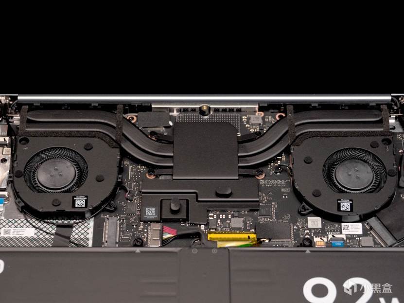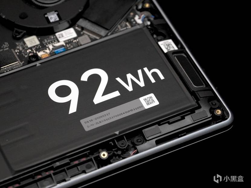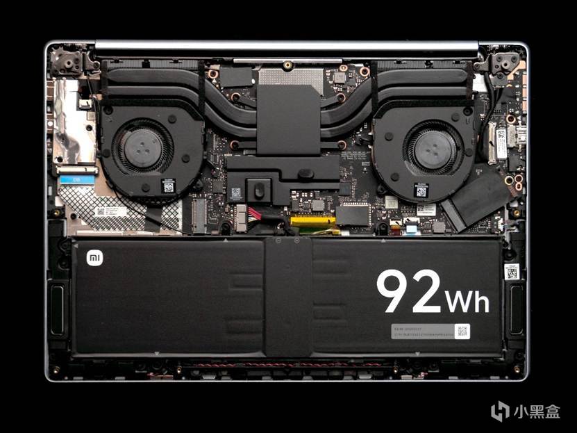 主板很工整,最显眼的就是电池上那个巨大的“92Wh”标识了: