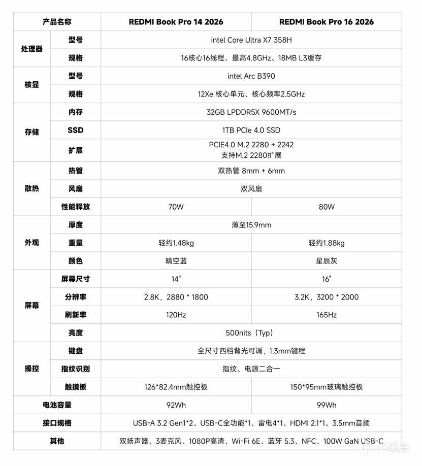 这次REDMI的Book Pro系列共发布了两款产品,14英寸和16英寸各一款,顶配配置都是直接拉满:全部是Intel Core Ultra X7 358H,而且依然是顶级的LPDDR5x 9600内存,70/80W性能释放,光这两点就足以傲视如今的轻薄本市场了!其余配置也毫不落伍,基本可以说都在主流水平之上: