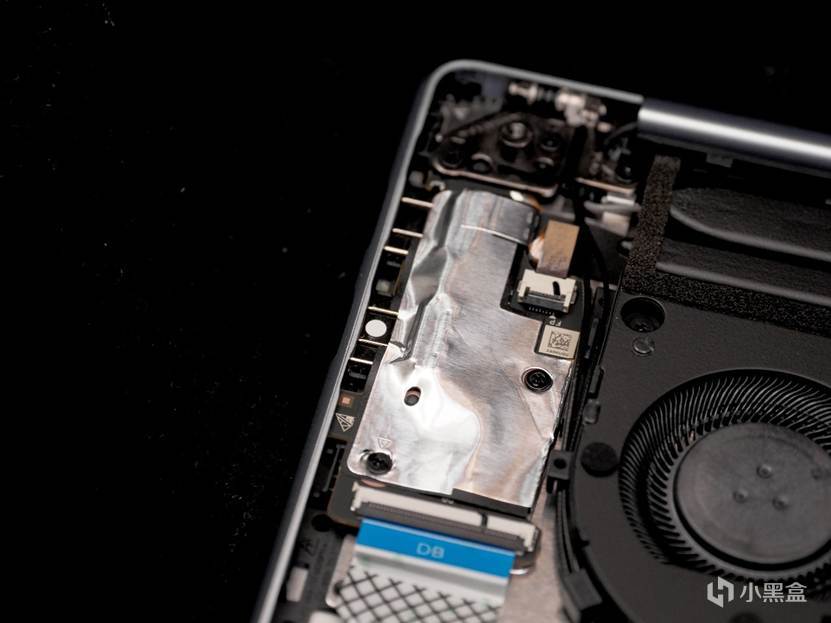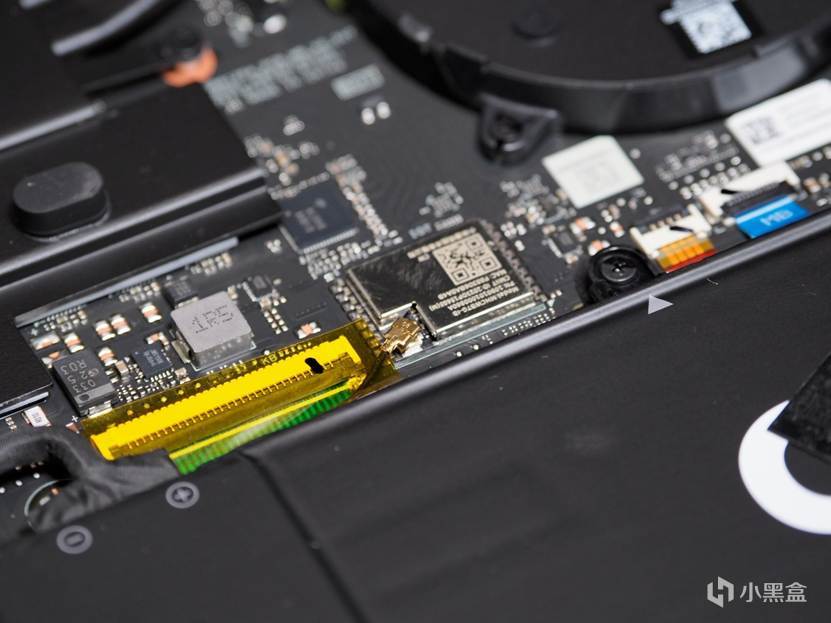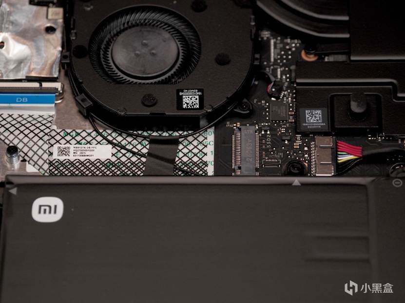 CPU采用6+8双热管双风扇对称设计,俗称“牛角”,14英寸版本标称70W持续释放,实际上这个数字还略有保守……CPU上面的屏蔽盖子下就是无敌的LPDDR5x 9600MT/s内存!这时候就体现出手机厂的供应链优势了:传统PC厂商还在为8533的货源发愁的时候,小米已经把顶级9600内存下放给了REDMI!