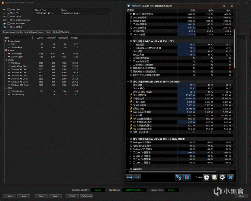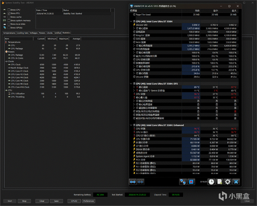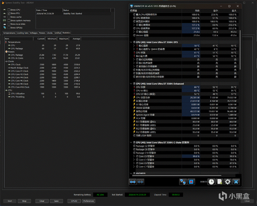 而且REDMI Book Pro 14 2026虽然标称是70W持续释放,但是实际上PL2给到了足足95W,PL1也有80W,对于X7 358H来说算是基本给满了: