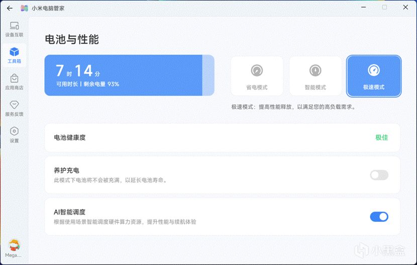 小米电脑管家里提供3+1种性能预设,分别是省电25W、智能45W以及插电下的狂暴模式70+W和离电状态下的极速模式65W: