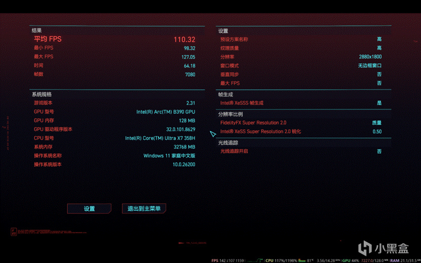 而且Intel这两年在显卡驱动上真的非常努力,版本更新是三家中最勤劳的,甚至先于AMD拿出了4倍帧生成,在多倍“拼好帧”的助力下像是2077甚至可以全分辨率、超级画质跑出110fps的成绩,黑神话测试工具也能用FSR的2倍帧生成+高画质跑出76fps(正式游戏已经更新支持了XeSS,帧率更高)这不说谁知道是核显啊!!