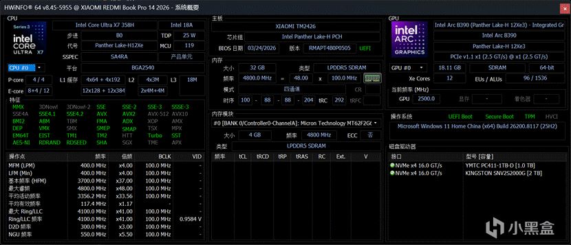 性能方面,再来复习一下REDMI Book Pro 14 2026的性能规格:CPU为Intel Core Ultra X7 358H,代号Panther Lake,4P+8E+4LPE组合,16核16线程;GPU为集成的Intel Arc B390显卡,12Xe核心,搭配9600MT/s的LPDDR5x内存,可以提供超过150GB/s的理论带宽,再加上足有Intel 2000元级独显B580 60%的核显规模,相当强大!PTL在移动平台的表现还是相当强悍的。