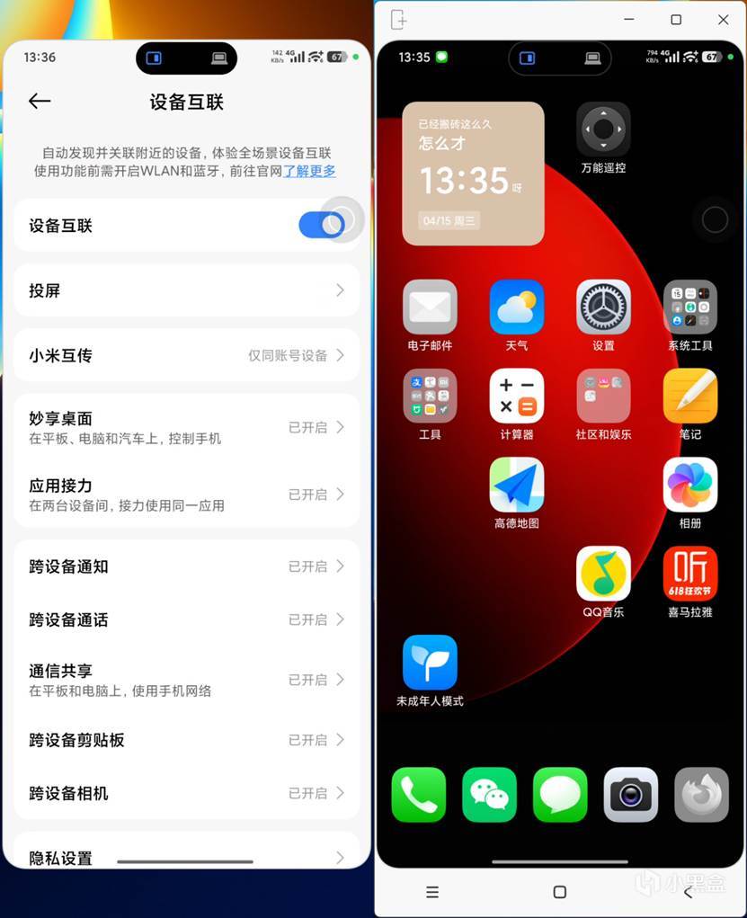 手机和笔记本链接成功之后,就直接互联互通了,桌面互相可以投屏,文件互传,控制也可以共享了,非常非常方便: