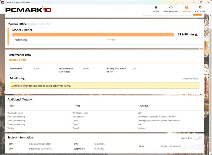 重头戏来了,续航,50%亮度省电模式25/80W的状态下,断网跑PCMark10现代办公测试,足足跑了31小时多!2天1夜!!而且还是99-2%的水平,从头跑到0肯定能超过32小时,是我目前目前见过最夸张的笔记本续航测试成绩了,没有之一!!!而且性能分数也有8194,相当强了!REDMI Book Pro 14 2026这块92Wh电池以及PTL和小米的能耗比调校非常强悍!!!