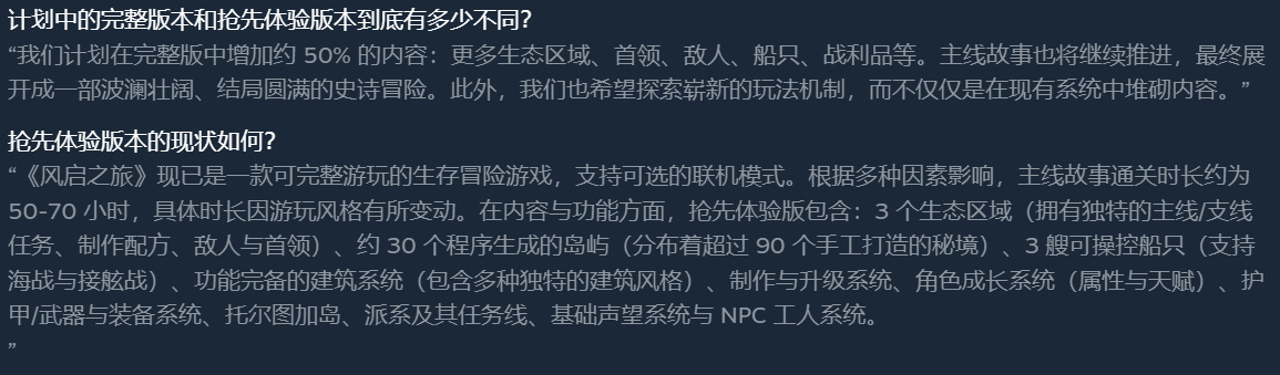 遊戲現有的流量就能支持上10小時的遊玩,而且現在的版本其實僅僅只是搶先體驗版本並沒有呈現遊戲的完整內容,完整的內容當中,光是主線劇情就會包含50~70小時的內容量。
