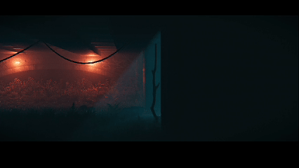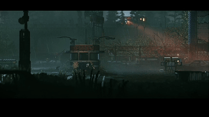 核災難廢土的世界觀設定,讓這個賽博朋克世界既未來又復古。沒有賽博朋克裏標誌性高樓大廈、車水馬龍的繁華街道,反而是破舊廢棄的街道、雜草叢生的荒野和幽暗的下水道,大面積暗部死黑留白,有一種破敗、褪色的冷感賽博,落日之下滿是荒蕪與絕望。