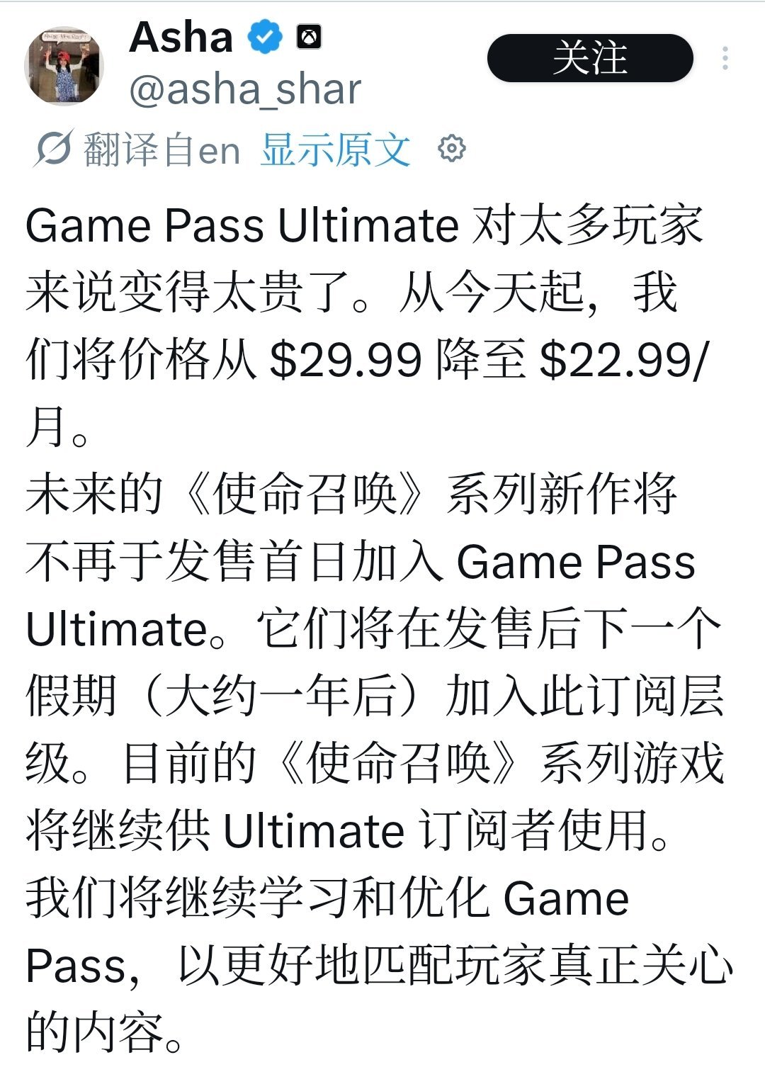 微软游戏部门Xbox新任CEO Asha Sharma于2026年4月21日正式发布降价信息。 它标志着Xbox Game Pass订阅服务的一次重大调整,既有“降价回馈玩家”的积极信号,也伴随《使命召唤》系列新作入库政策的明显收紧。