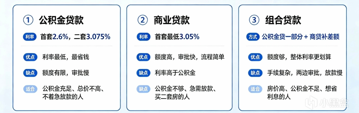 公积金贷款是三种方式里利率最低的,2026年首套房5年以上利率已降至2.6%,二套房3.075%。但公积金贷款额度有限,一二线城市单人通常只能贷几十万,远不够买房总价。审批流程也比商贷更复杂,放款慢。