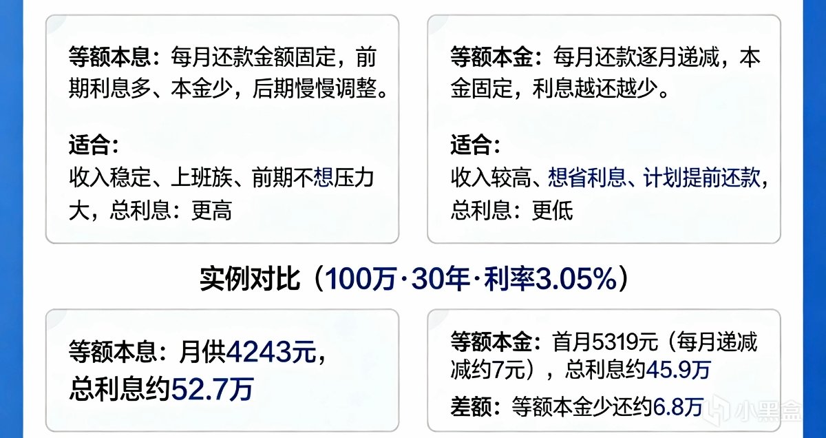 举个例子:贷100万、30年、利率3.05%。等额本息每月固定还4240元,30年总利息约52.6万;等额本金首月还5315元(每月递减约7元),30年总利息约45.9万。等额本金少还约6.7万利息,但前期每个月多还1000多块。