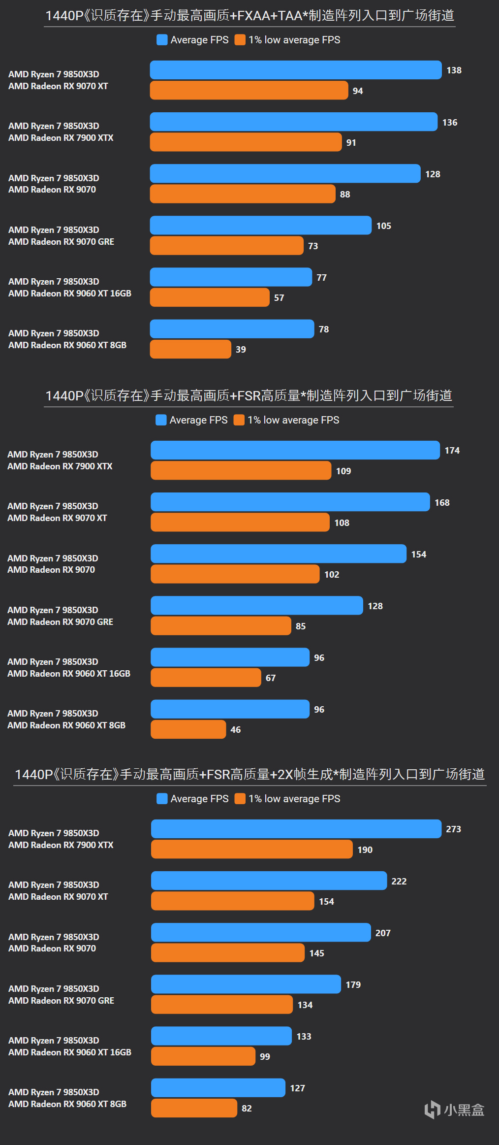高刷標準門檻剛好落到RX 9070 GRE上,至於RX 7900 XTX和RX 9070 XT,還是會在使用FSR之後,RX 7900 XTX就做能到反敗爲勝,只是相比1080P優勢縮減了。