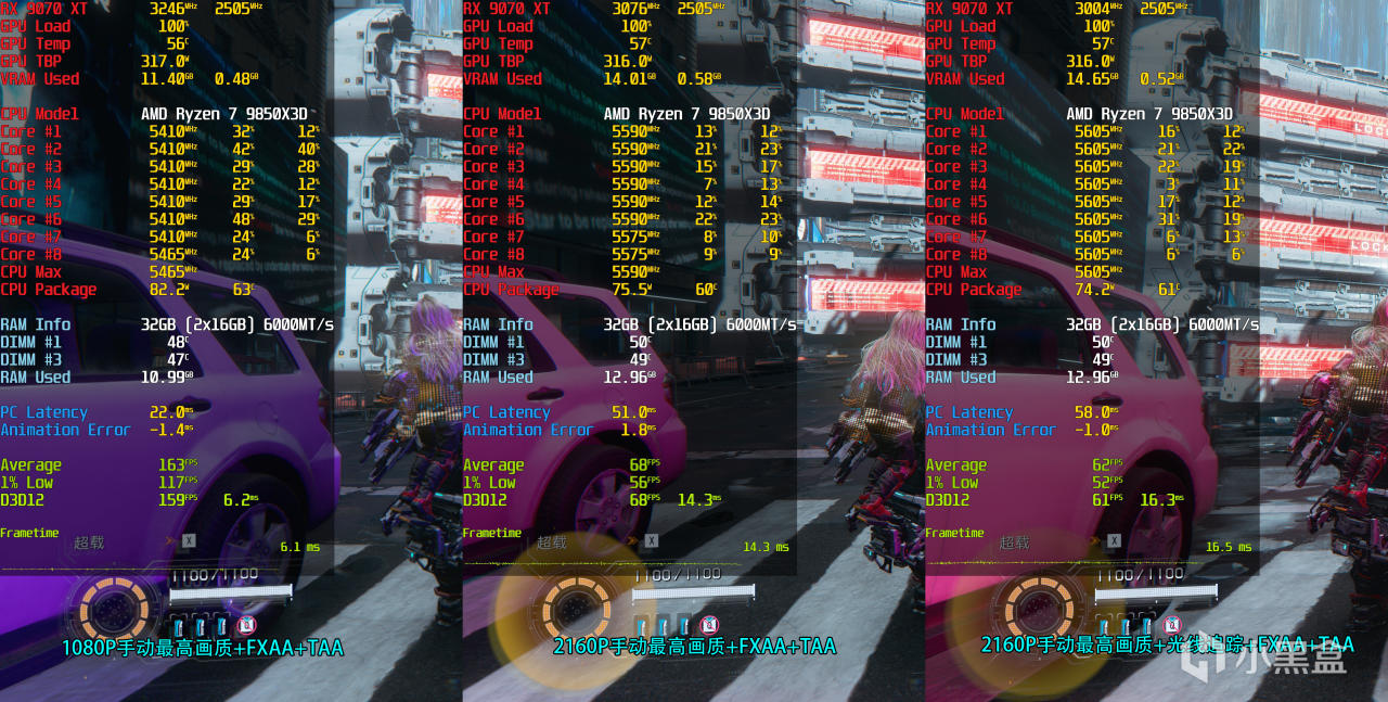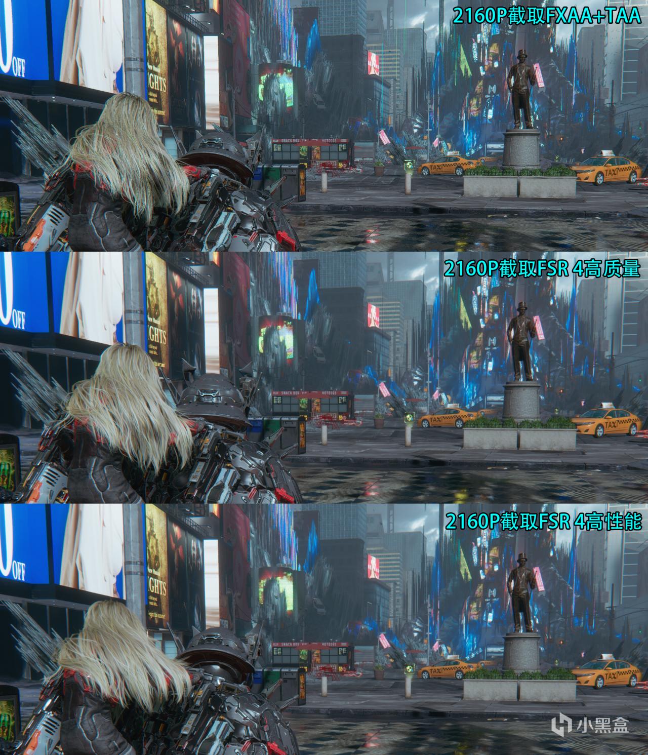 以上是FXAA+TAA(原生)、FSR 4.1高質量和FSR 4.1高性能三種設置的畫面截取對比,原生畫面看似銳利其實瑕疵非常明顯,存在毛髮質感粗糙、噪點(毛髮、暗部區域)、狗牙處理不到位、遠景線條渲染等問題,開啓FSR 4.1之後以上這些通通都能完美解決,而且在4K分辨率中,高質量和高性能這兩檔畫質表現基本是沒差別的。